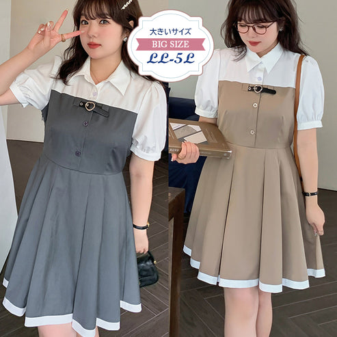 ■ ハートバックルの重ね着風ミニ丈プリーツワンピース(LL/3L/4L/5L)