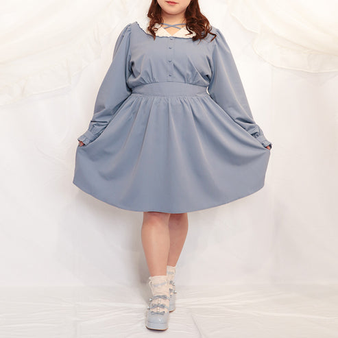 ■ レース襟のブルーミニ丈ワンピース(ワンサイズ/3L-4L-5L相当)/Taberunosky(タベルノスキー)