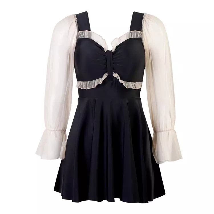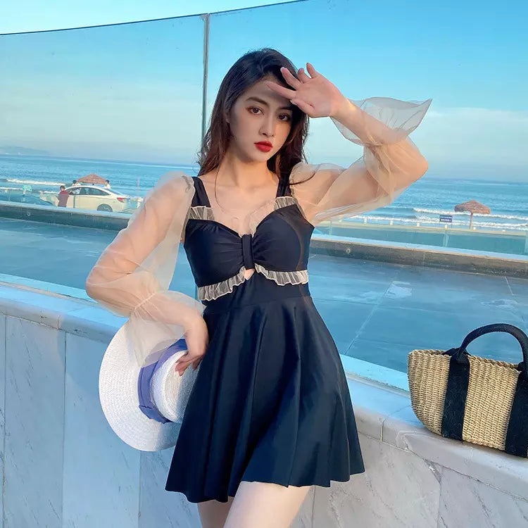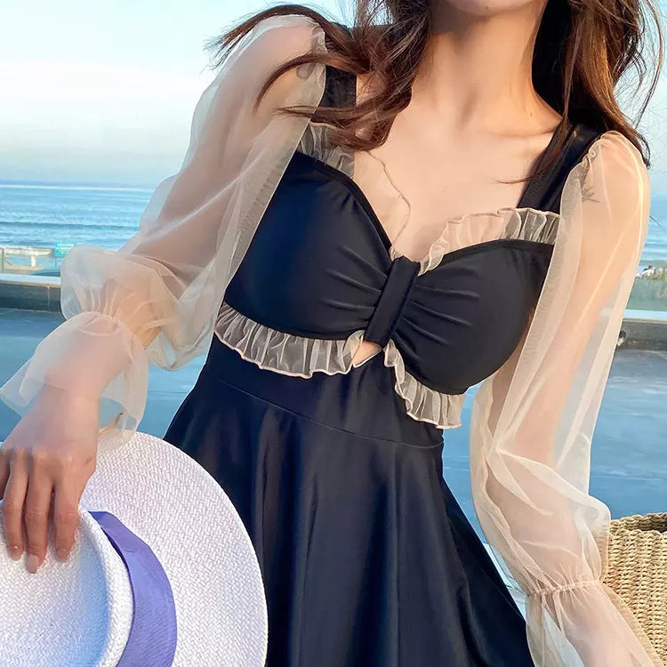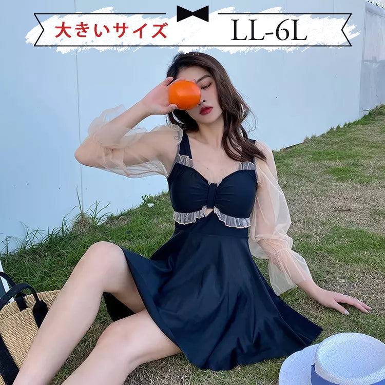 This one-piece swimsuit features a stylish frill ribbon design on the chest and sheer material. It's available in sizes 2L-6L!