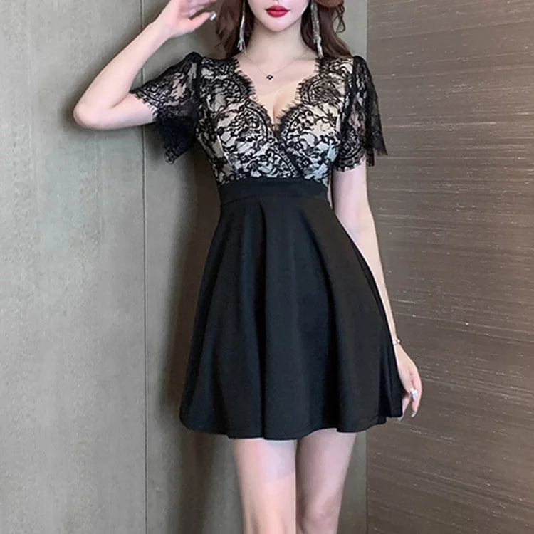 This mini dress features a deep V-neck and lace design that is cute and sexy.