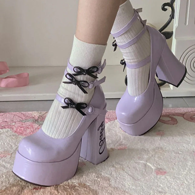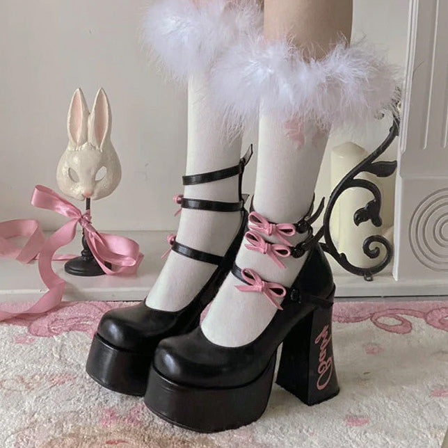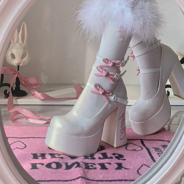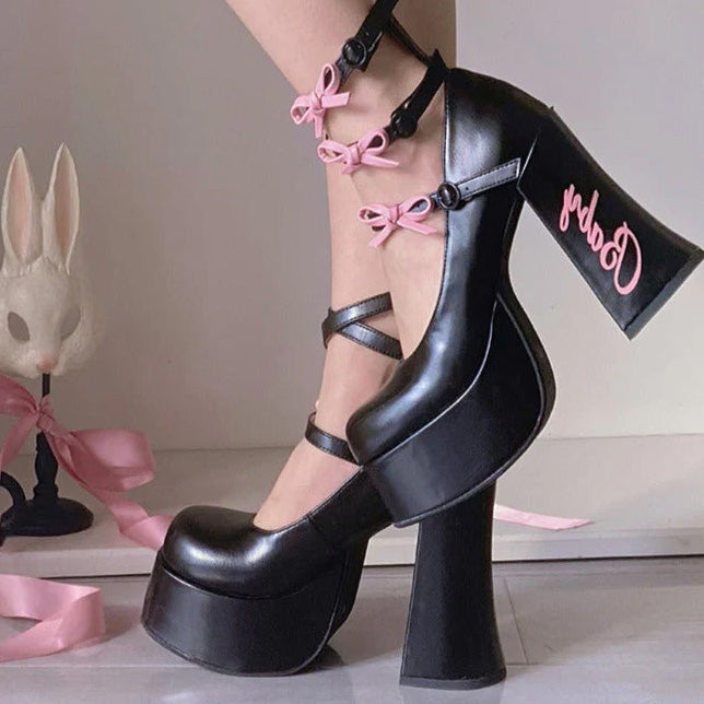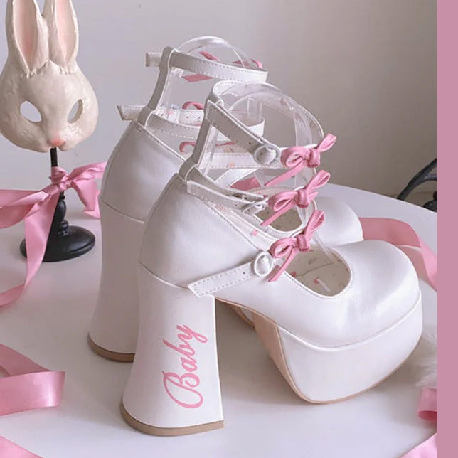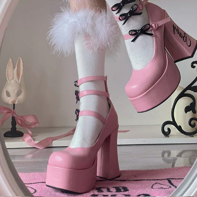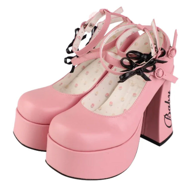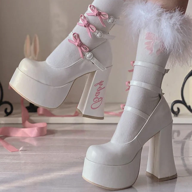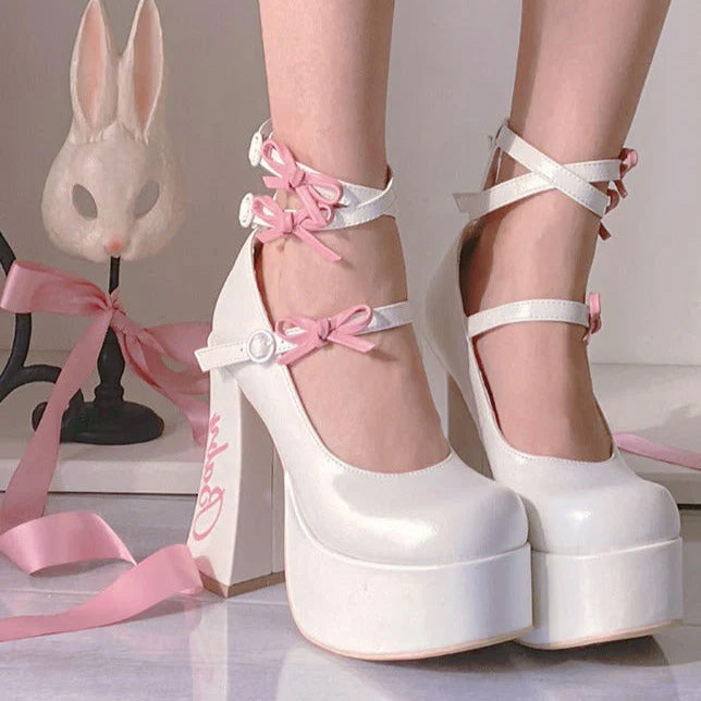 These cute heel pumps feature 12cm heels and are full of ribbons and frills that make your legs look longer and more beautiful.