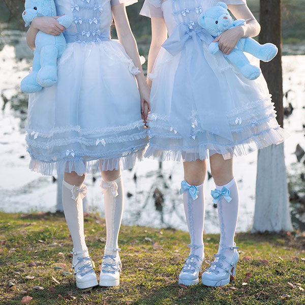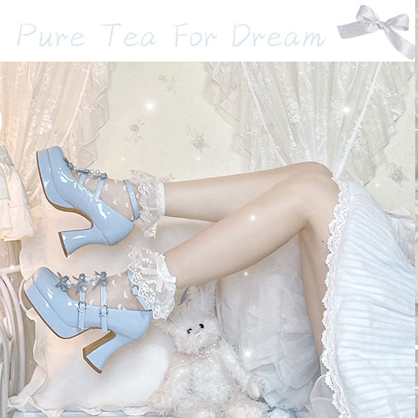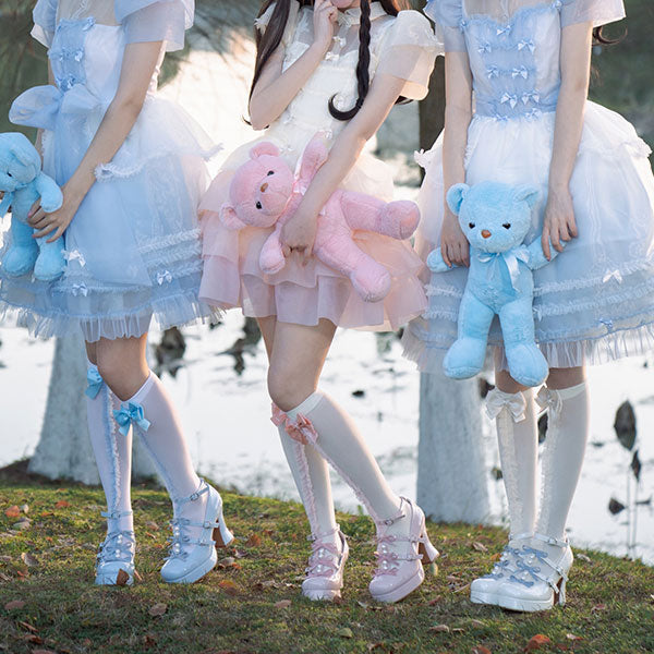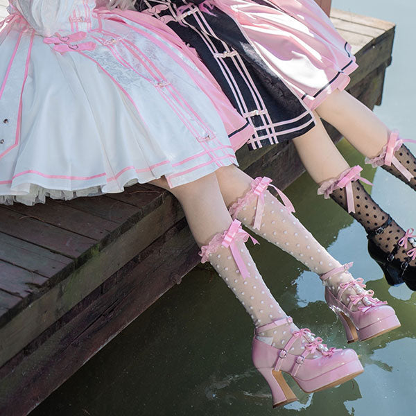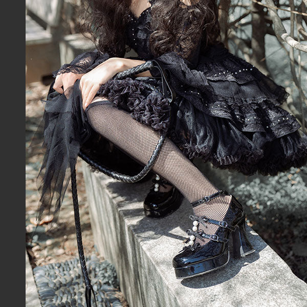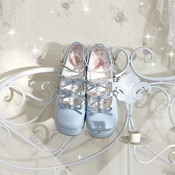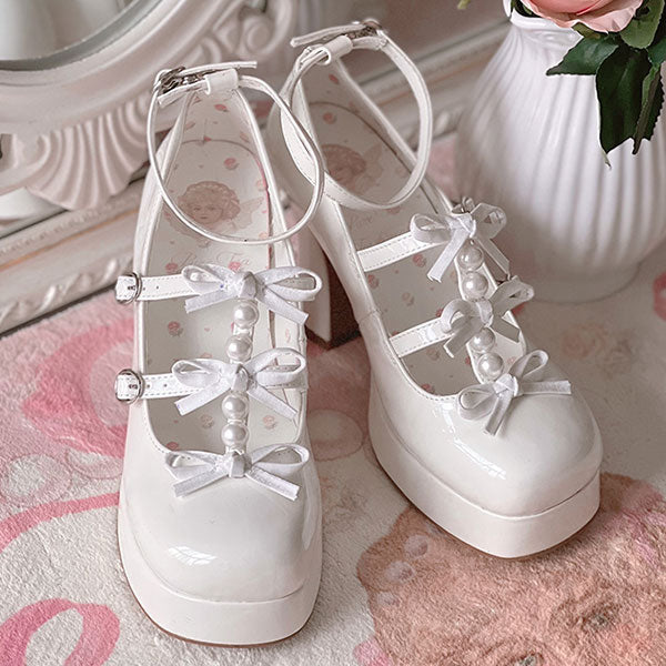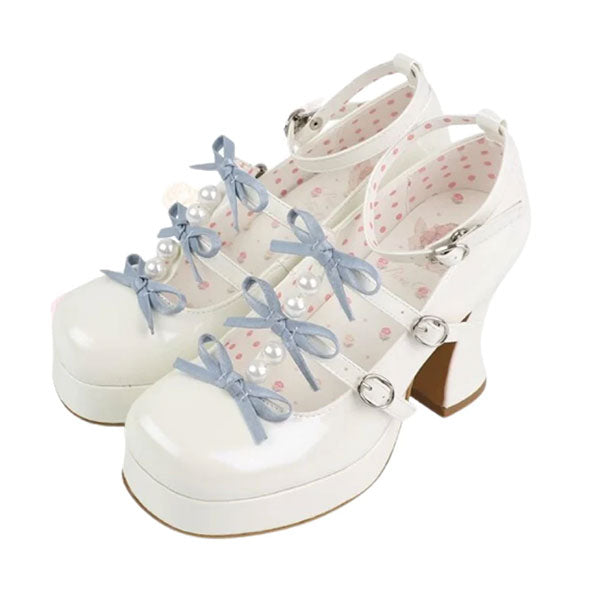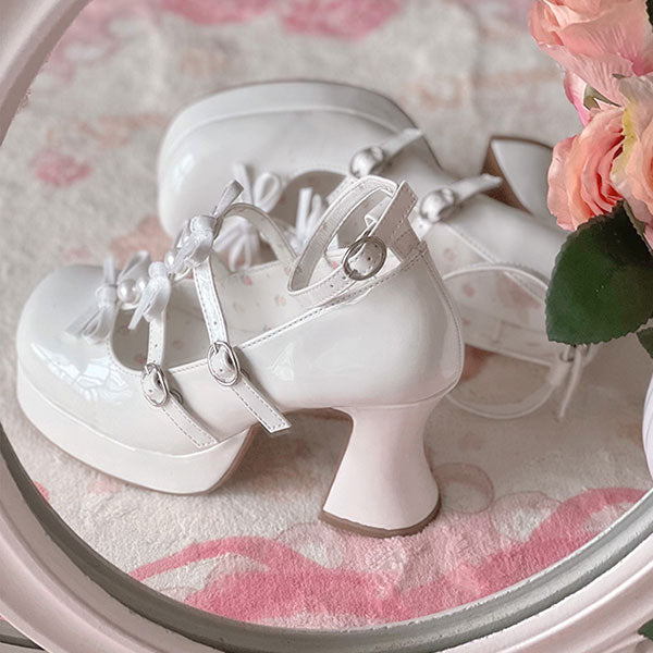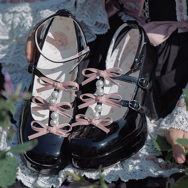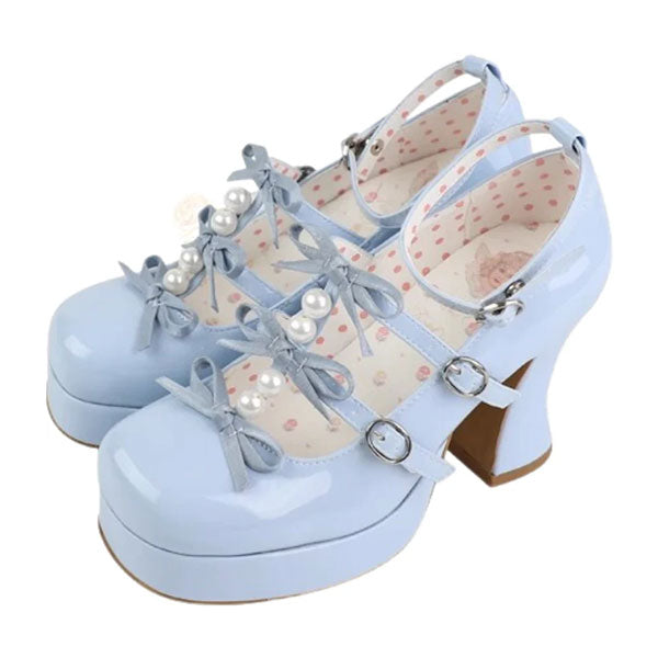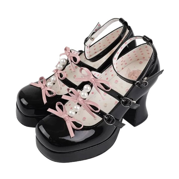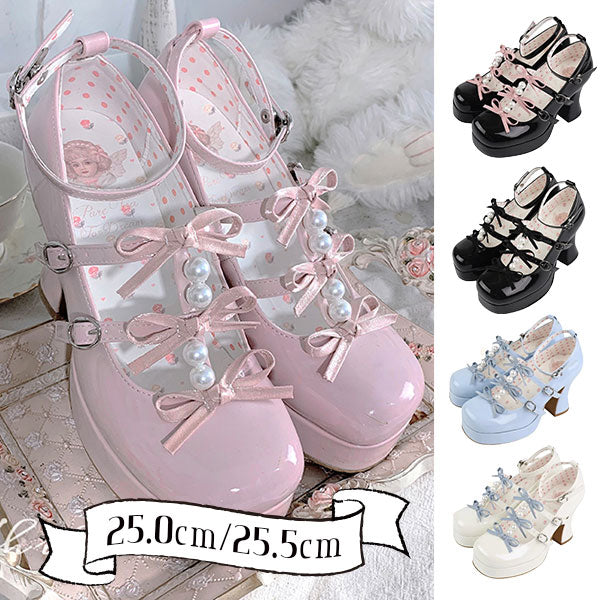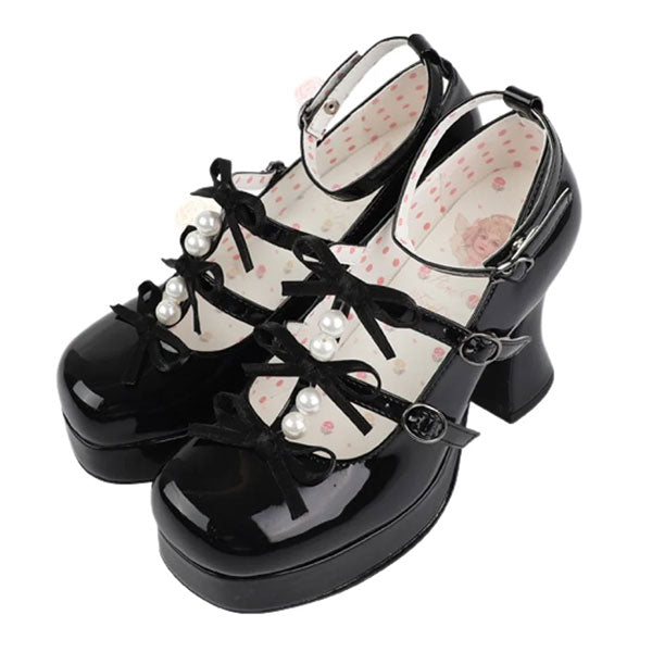 These plus-sized Lolita pumps feature a super cute triple ribbon and pearl design.