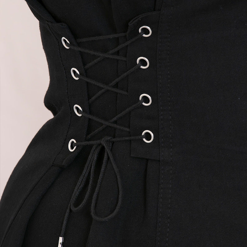 The lace-up section can be tightened by yourself, so it doesn't feel too tight and gives a flattering waistline. It's also recommended for the cold season if you wear a top or cardigan underneath. The zipper on the back makes it easy to put on and take off.