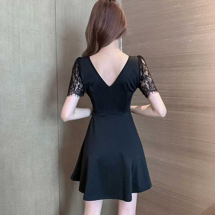This plus-sized mini dress is sexy and cute with white lace sleeves and sheer lace at the waist.