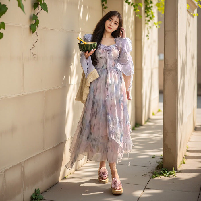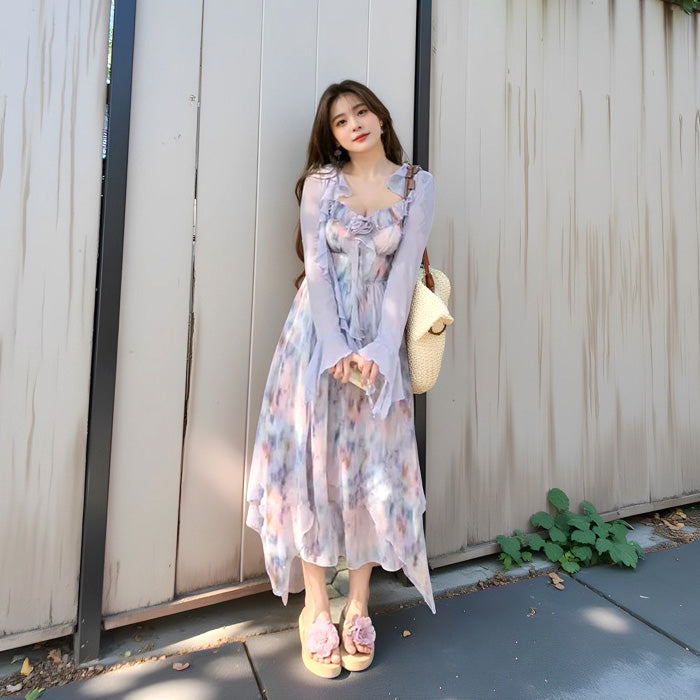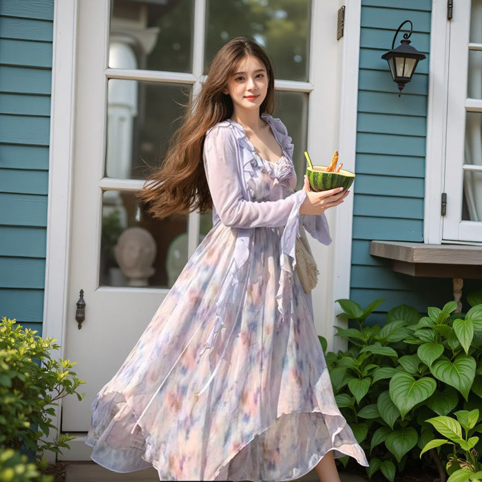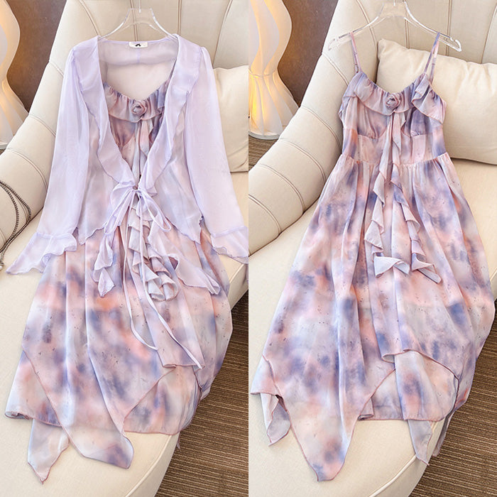 This set includes a camisole dress made of lightweight fabric with a frilly irregular hem and a cardigan.