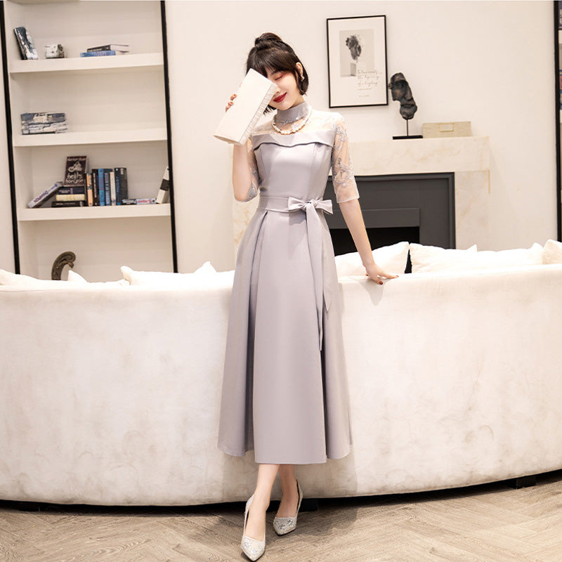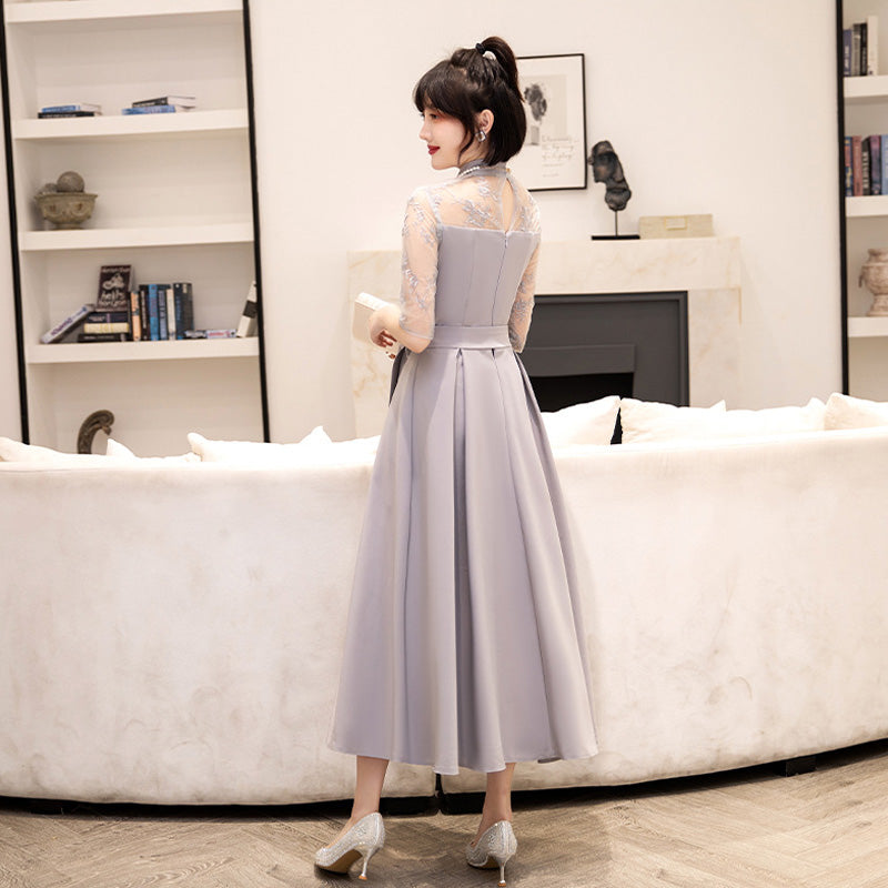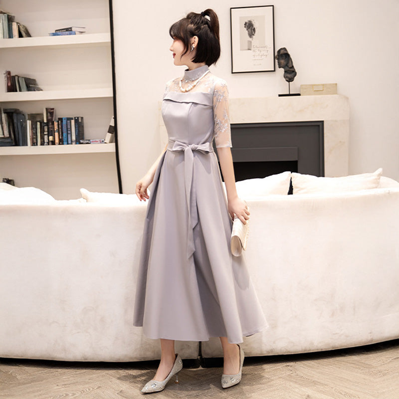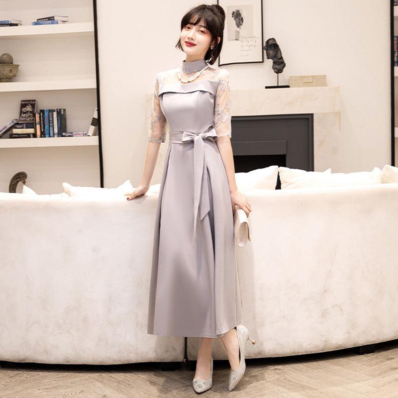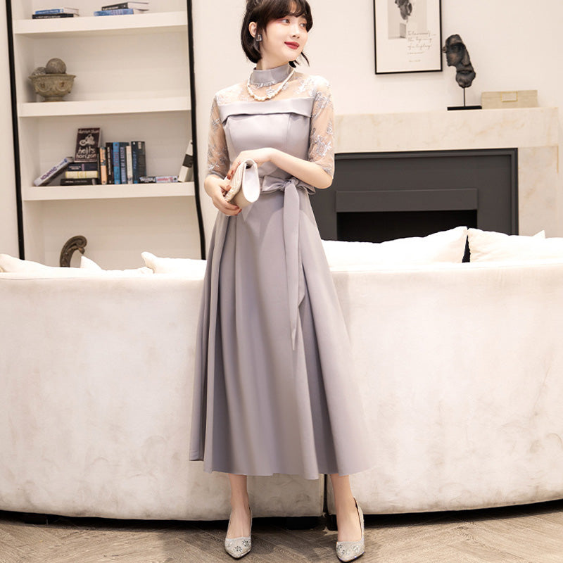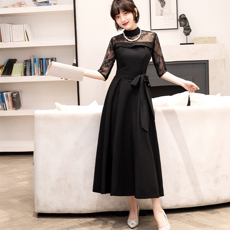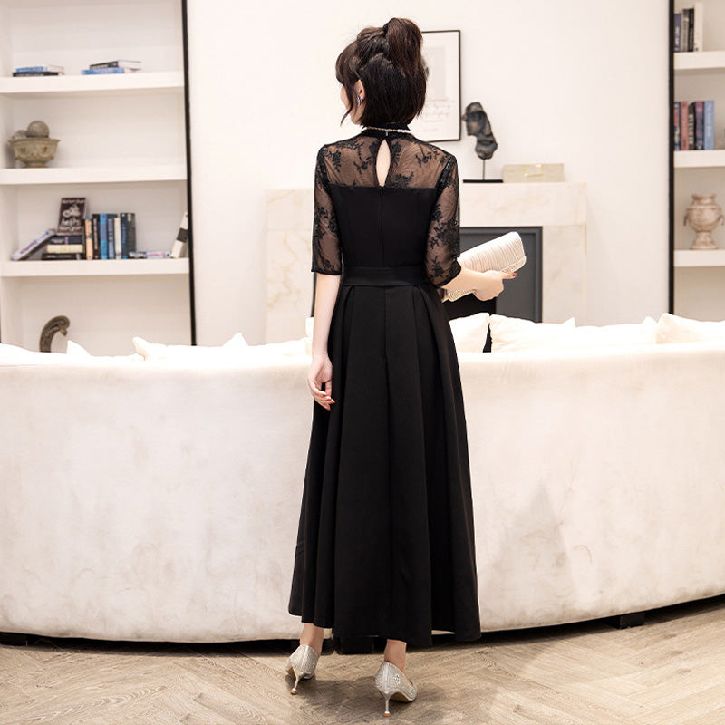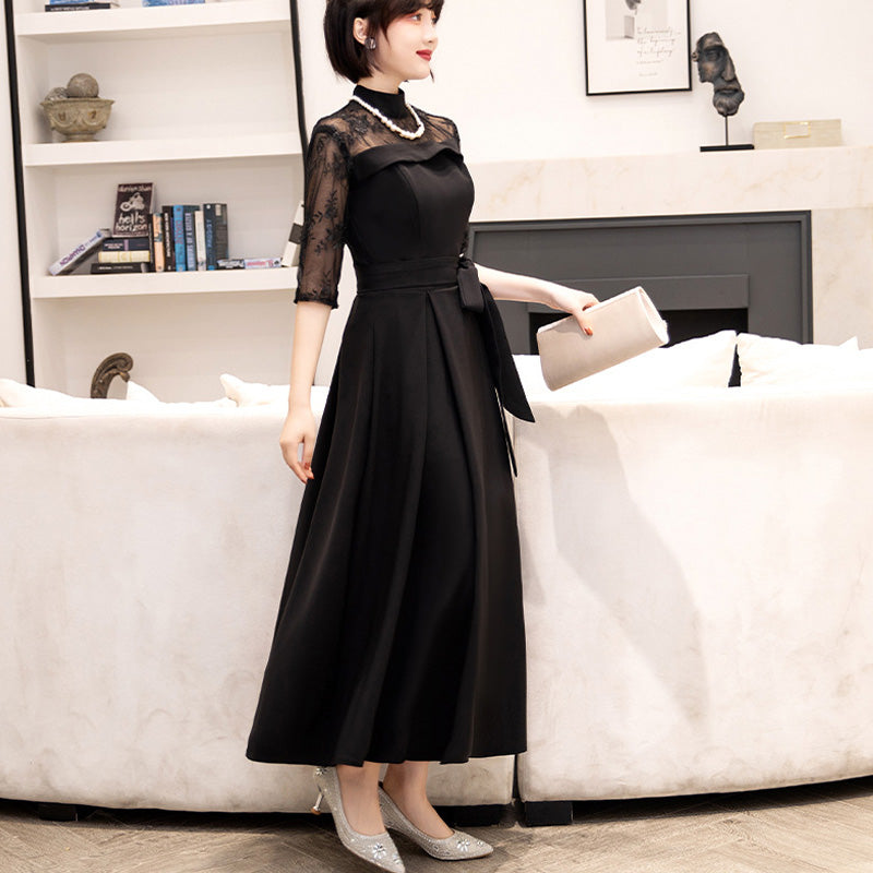 Delicate lace is used from the chest to the sleeves, drawing the eye upwards and creating a refined impression while concealing the figure.