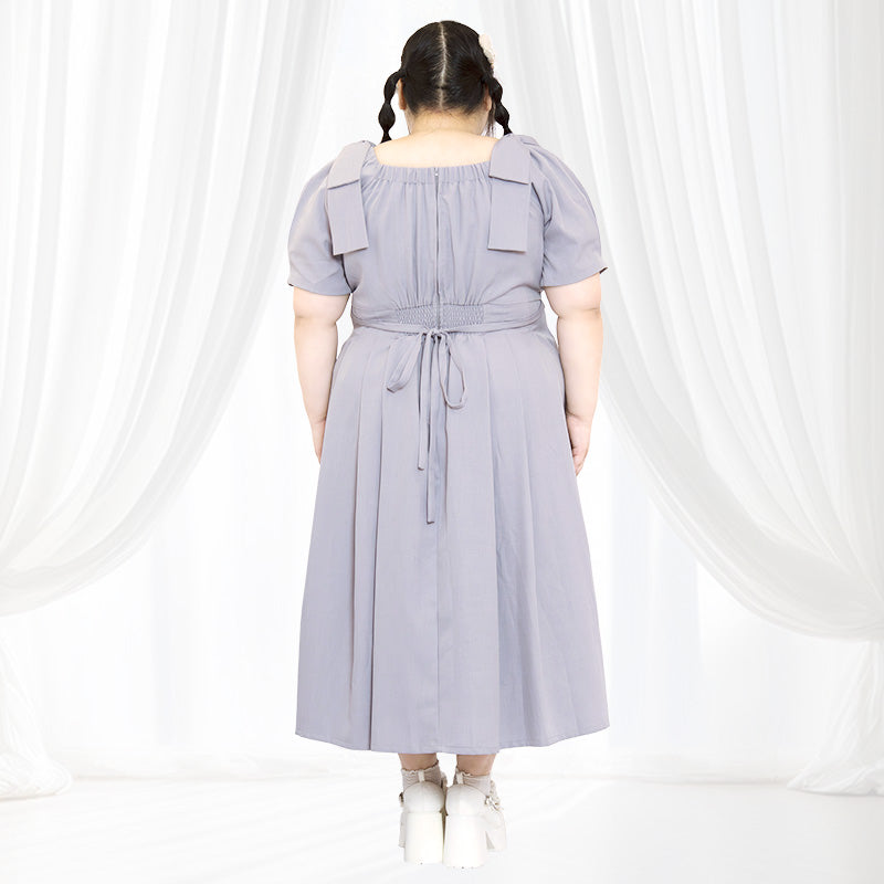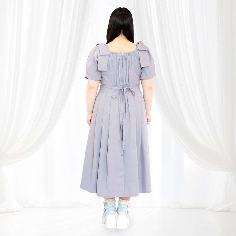 A magical dress in a melting muted blue with a large ribbon on the shoulders that makes it incredibly cute.