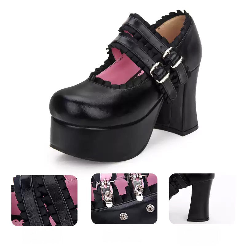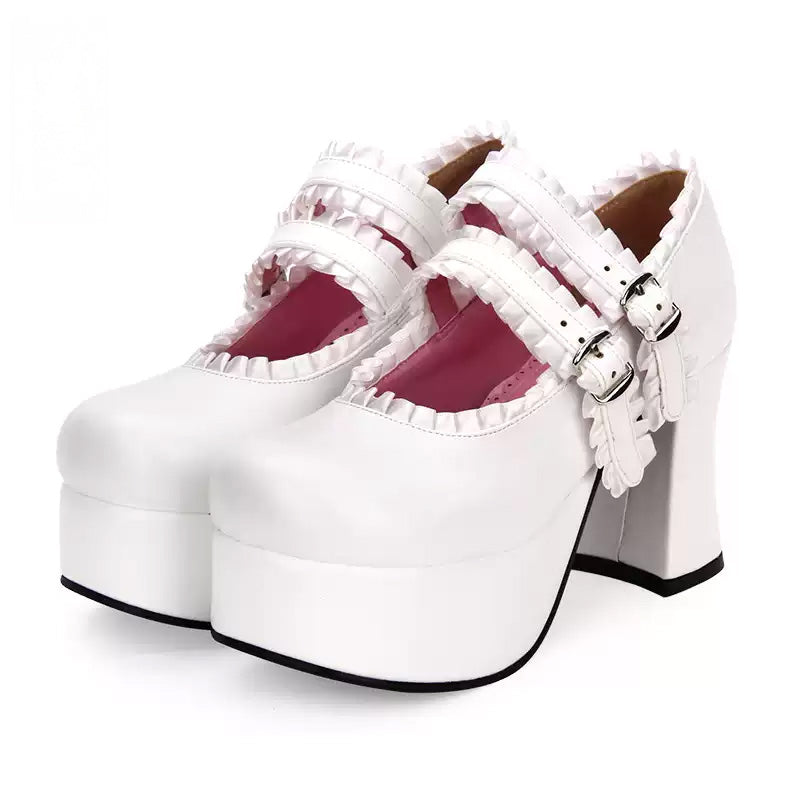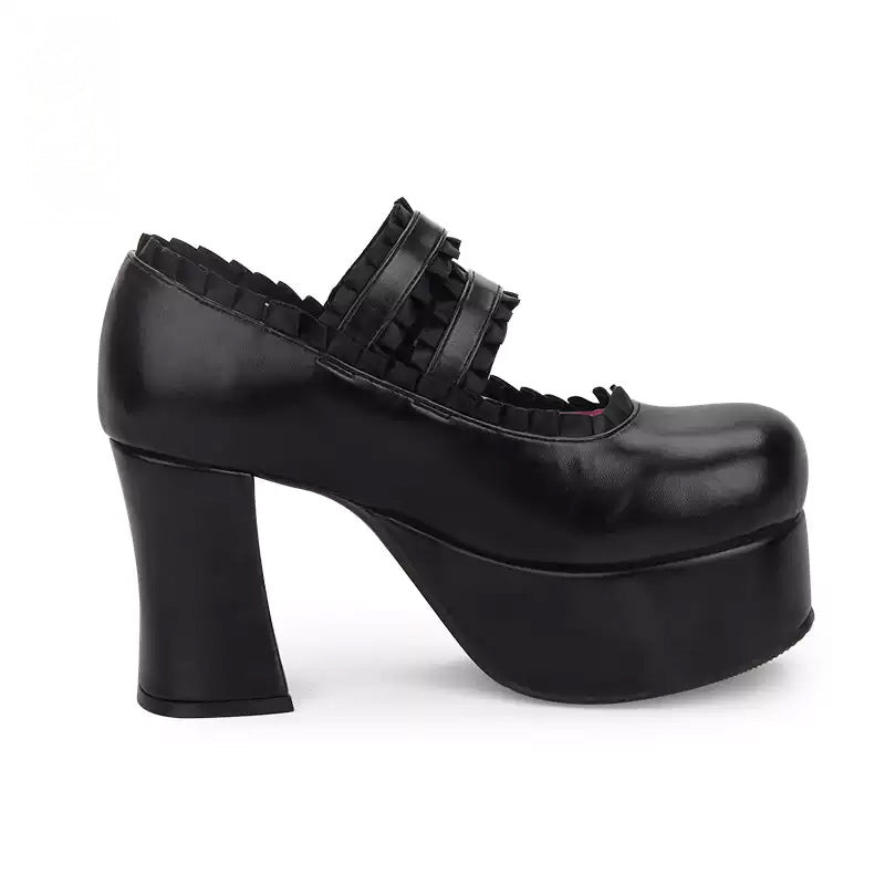 Available in a wide range of sizes from 22.5cm to 28.5cm, these shoes comfortably fit even high-arched, wide feet. The double strap provides stability, while the ruffled trimmings make your ankles look slimmer, making them both cute and easy to walk in. The high, platform heel elongates your legs and enhances your style, while the highly cushioned insole makes them comfortable to wear for long periods of time. The soft interior lining reduces blisters, making them perfect for events, concerts, or walking around town.