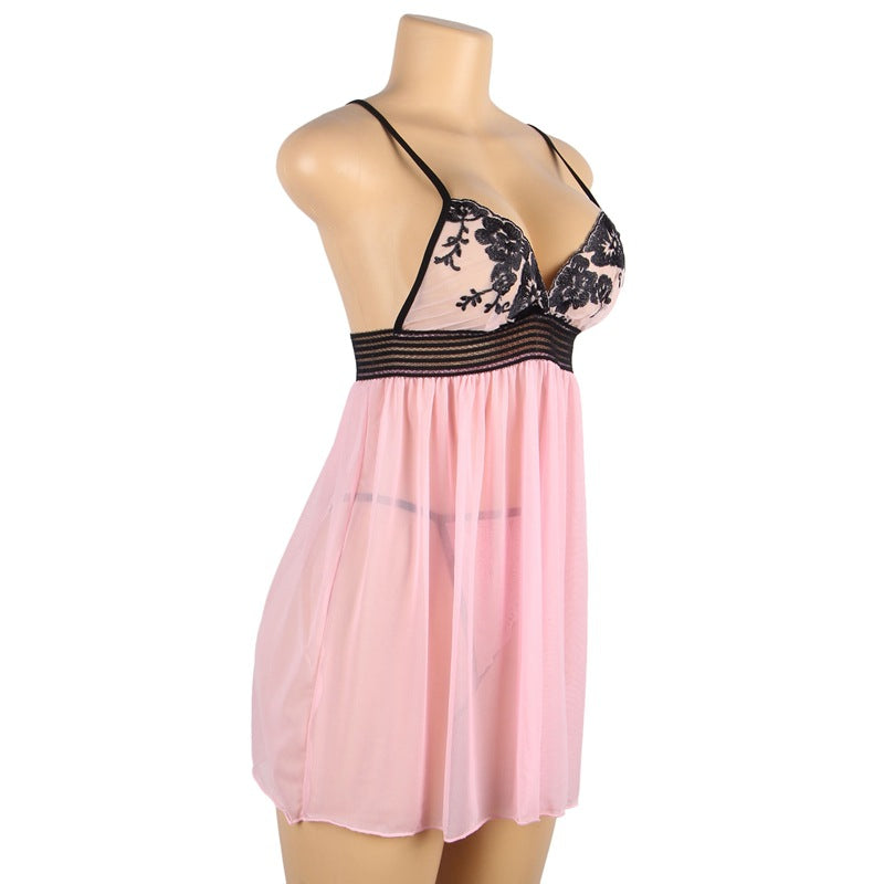 Delicate black lace accents the bust, creating a luxurious and glamorous look. The sheer pink material gently spreads out, gently covering the abdomen and waist, flattering the body line.