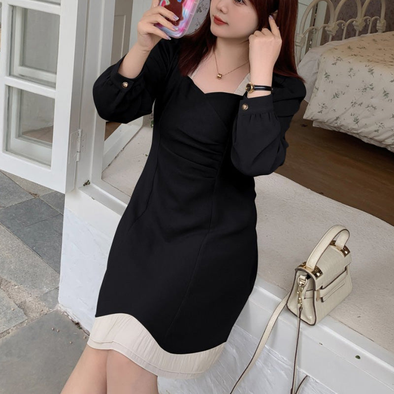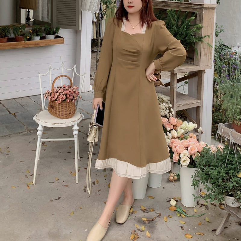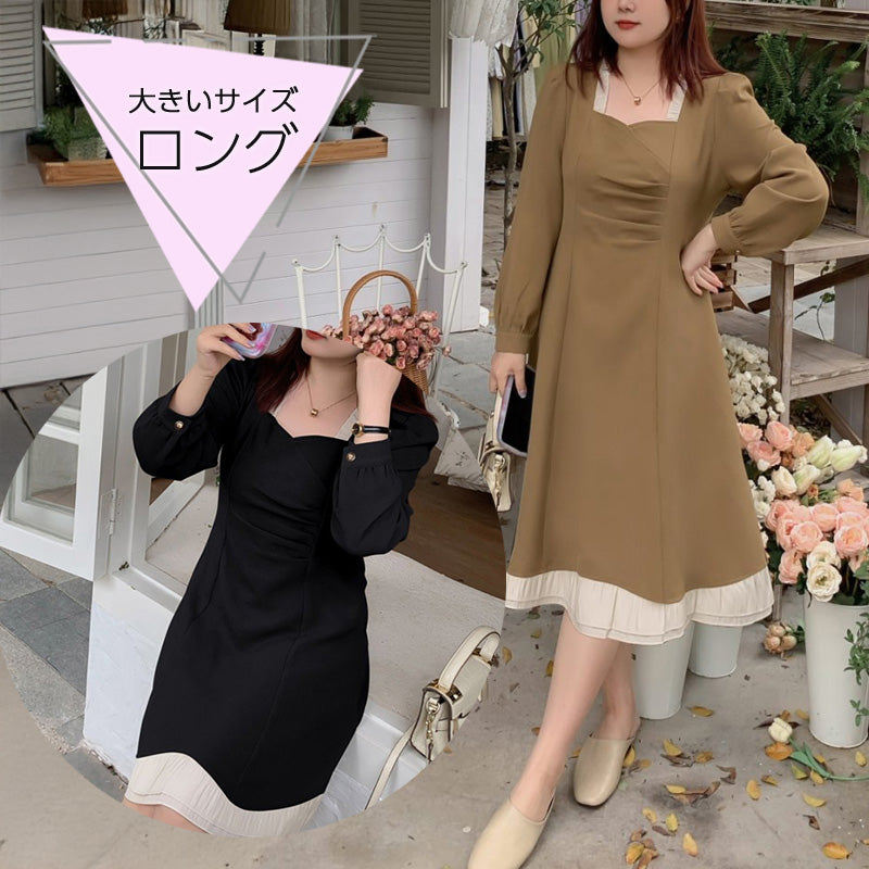 大きいサイズレディースHeart-shaped neck long-sleeved ruffle long dress (LL/3L/4L/5L/6L)