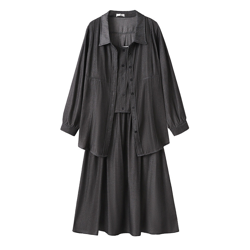 The set includes a luxurious three-piece set consisting of a loose-fitting shirt, an inner camisole, and a long skirt.