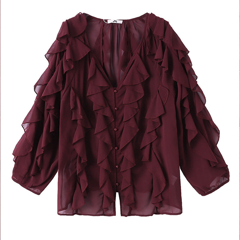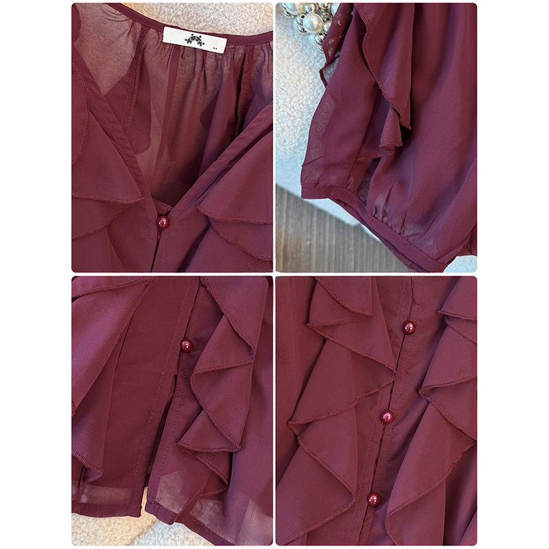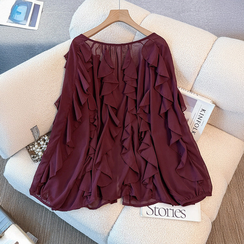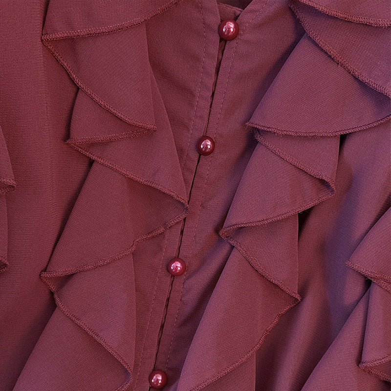 Introducing a plus-size frilled blouse that exudes elegance and style , perfect for sophisticated women. Luxurious frills from the bust to the hem sway gently with every movement, enhancing both elegance and femininity. The deep wine red color not only flatters the skin, but is also versatile enough to wear for special occasions or at the office.