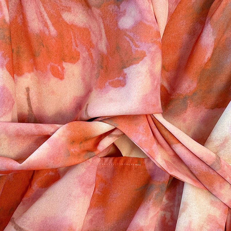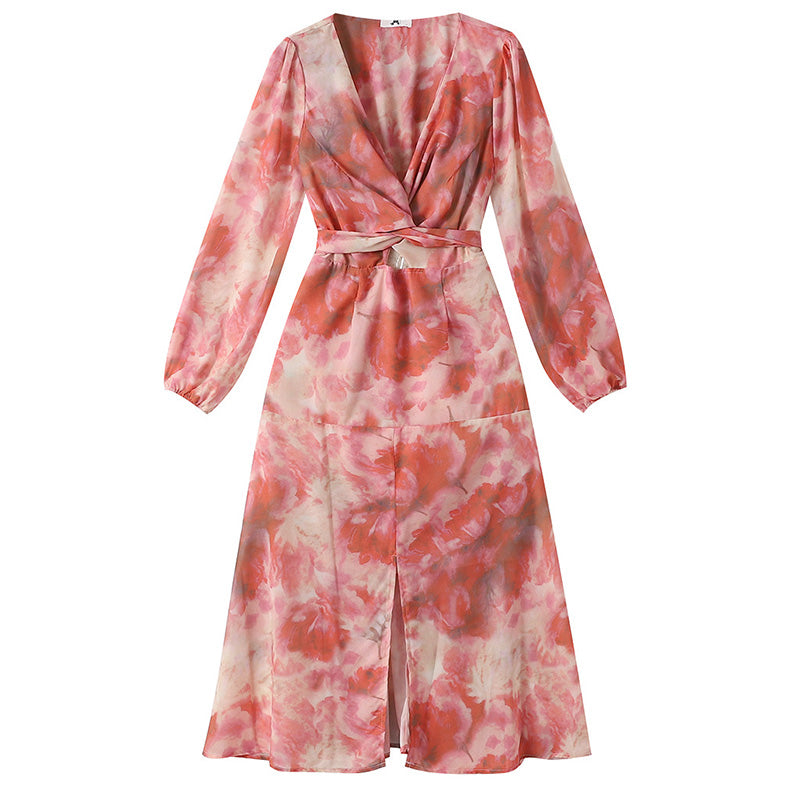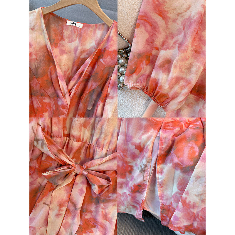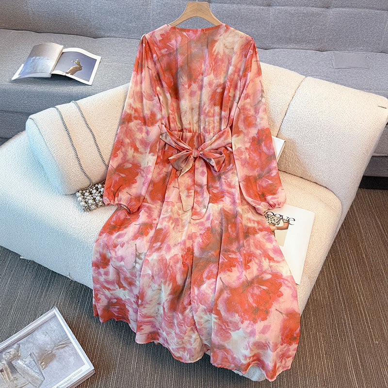 This plus-size chiffon dress features a beautiful petal-like gradation of vibrant red and orange. Crafted from a soft, sheer material, the flowing silhouette gently flatters plus-size figures. The V-neck design creates a flattering silhouette, while the ribbon belt at the waist creates a natural, slender figure.