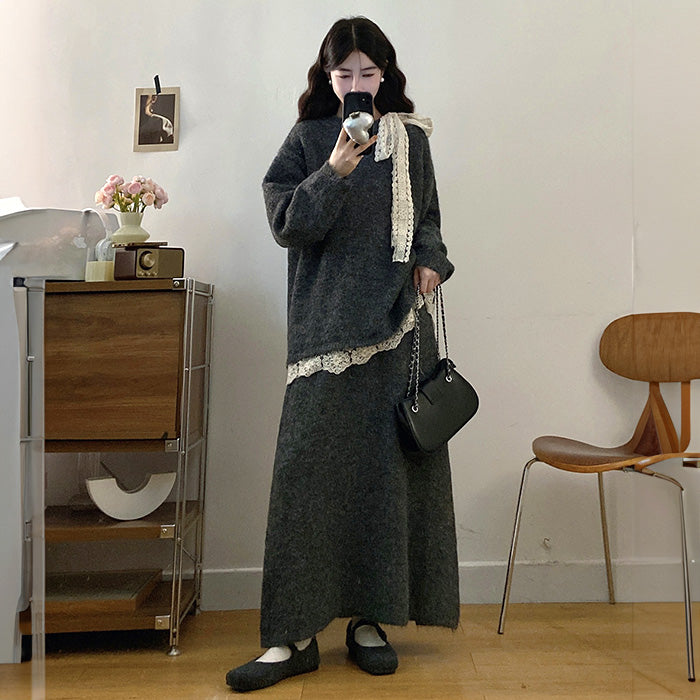 大きいサイズレディースふんわりレースリボンのあったかセットアップ(L/2L/3L/4L/5L)