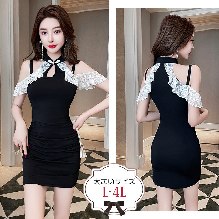 肩を美しく見せるオープンショルダーと、繊細な白レースのフリルが女性らしさを引き立てます。