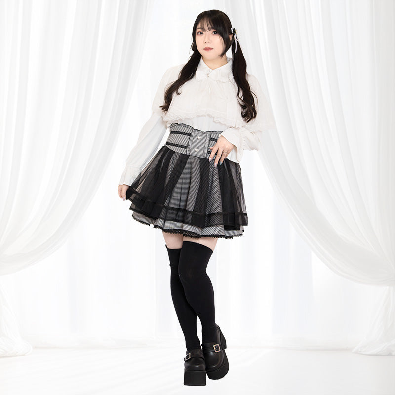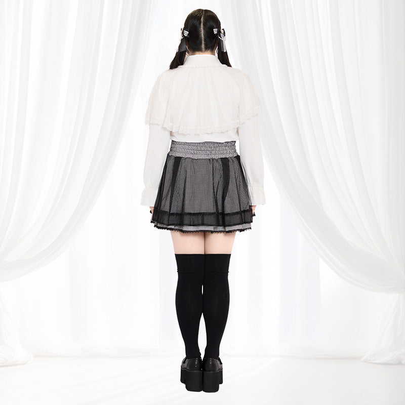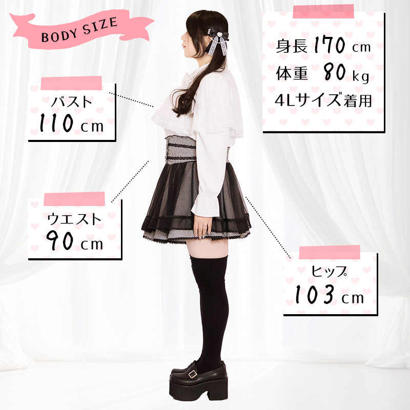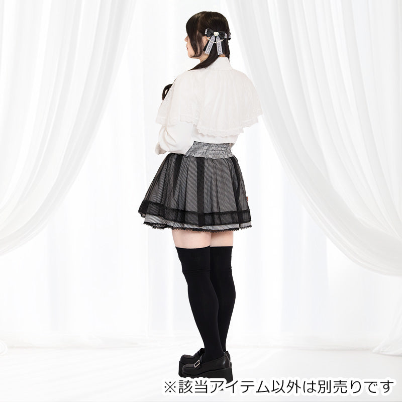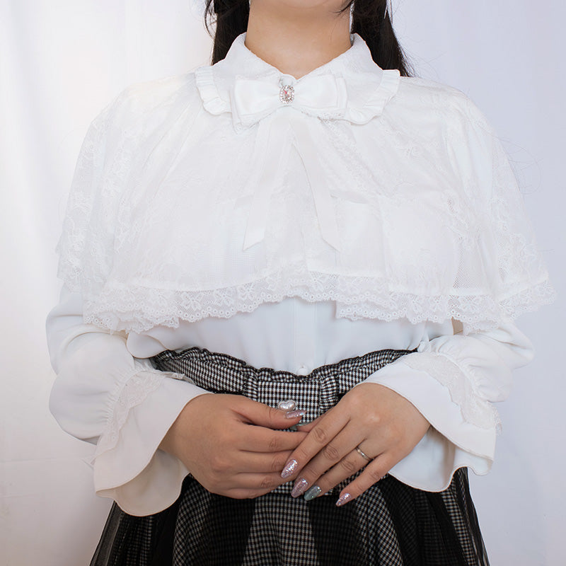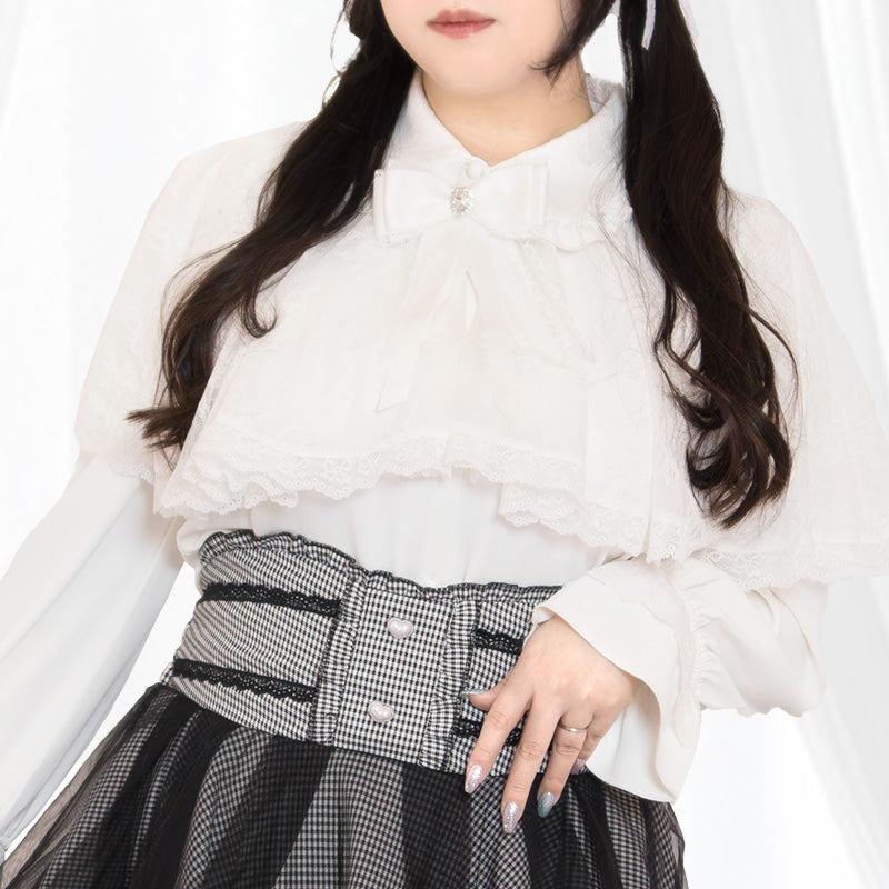 ケープ部分は繊細なレースをたっぷり。動くたびにふわっと揺れて、上半身のシルエットをやさしくカバーします。ぽっちゃりさんが気になりやすい二の腕や肩まわりも、ケープが視線を分散してくれるので、着るだけでバランスが取りやすいです。首元はきちんと感のあるスタンド風で、甘すぎない地雷コーデに。