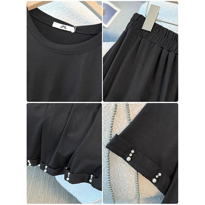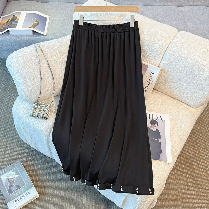 裾や袖口にはさりげないパール装飾があり、シンプルなブラックコーデに上品なアクセントをプラス。
