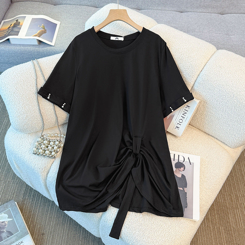 ゆったりシルエットのトップスはフロントにリボン風ドレープが入っていて、自然に体のラインを整えてくれます。