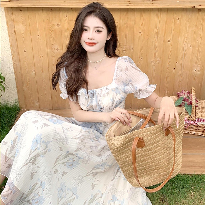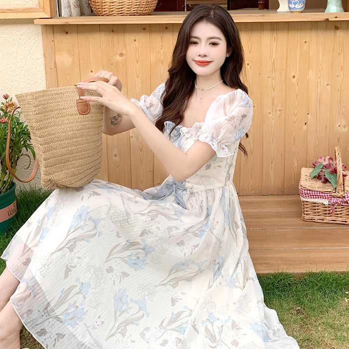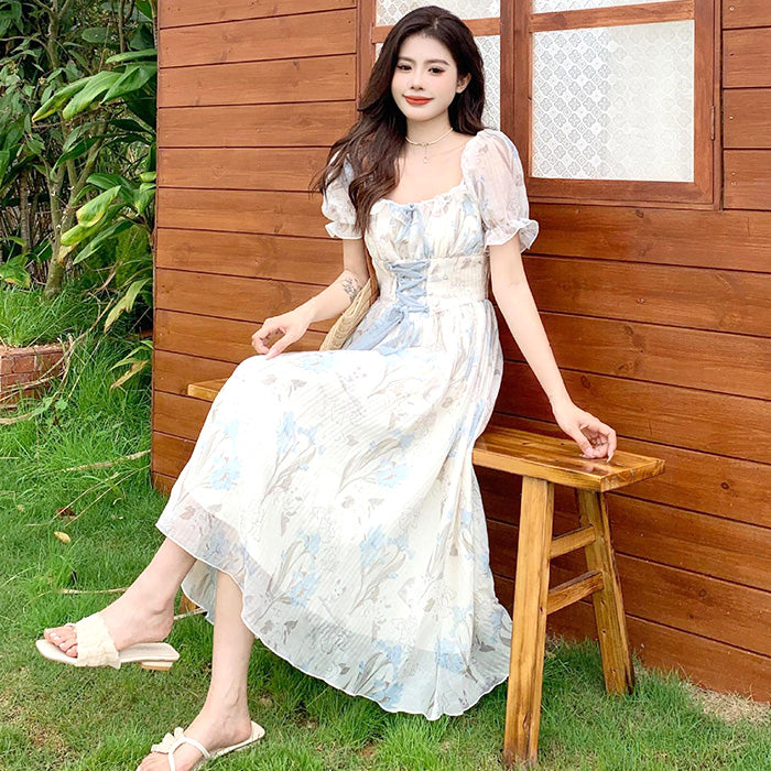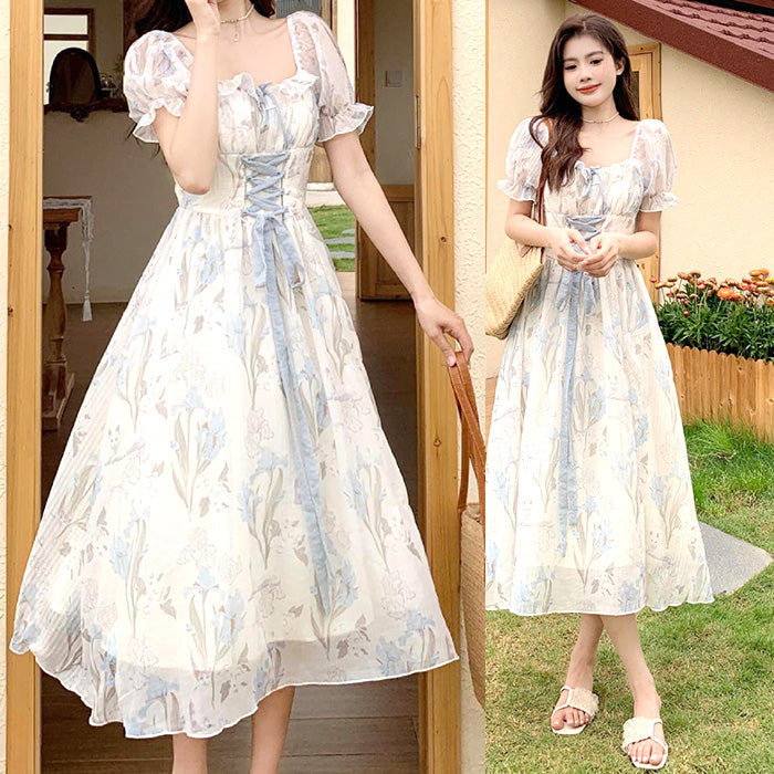 やさしい色合いの花柄がふんわり広がる、上品でガーリーなロングワンピース。