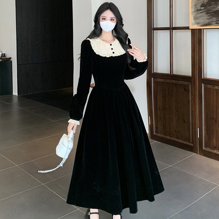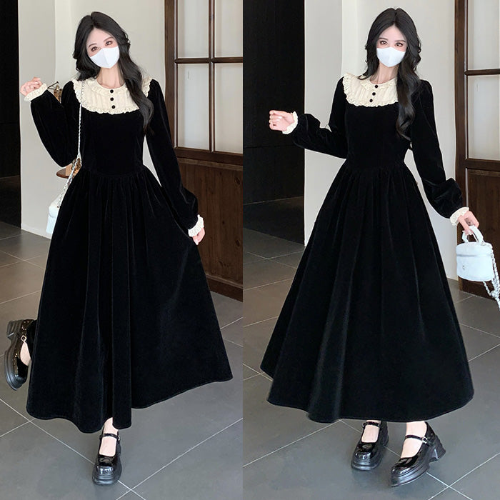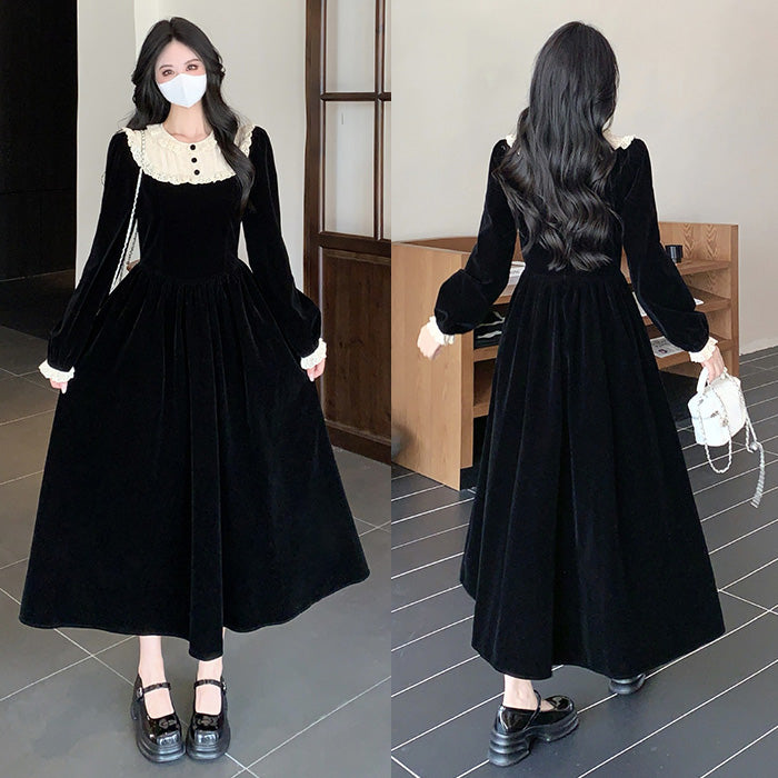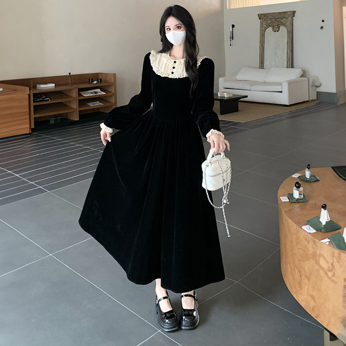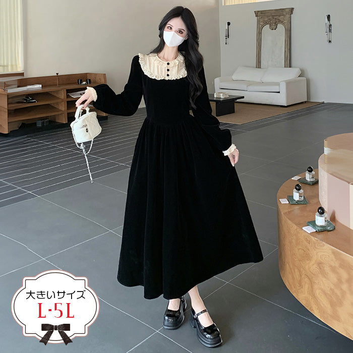 上品な黒に、やわらかなレース襟が映える、大きいサイズのロングワンピースです。