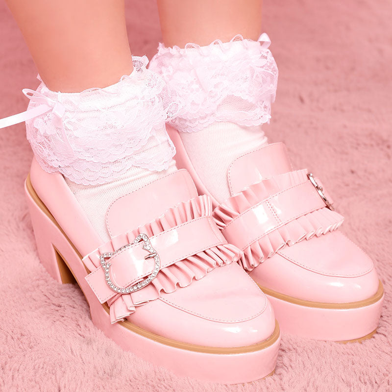 キラキラ輝くネコ型バックルとフリルベルトがときめく厚底ローファー。安定感のあるヒールで歩きやすさもバッチリ。丸みのあるフォルムで足幅もやさしくフィットし、大きいサイズ対応(24.5cm~27.0cm)だから安心。コーデを甘く仕上げたい地雷系・量産型さんにぴったりの一足。甘辛MIXコーデやロリータコーデとも相性◎で、お出かけから推し活まで使える万能デザイン!ブラックとピンクの2色展開♡