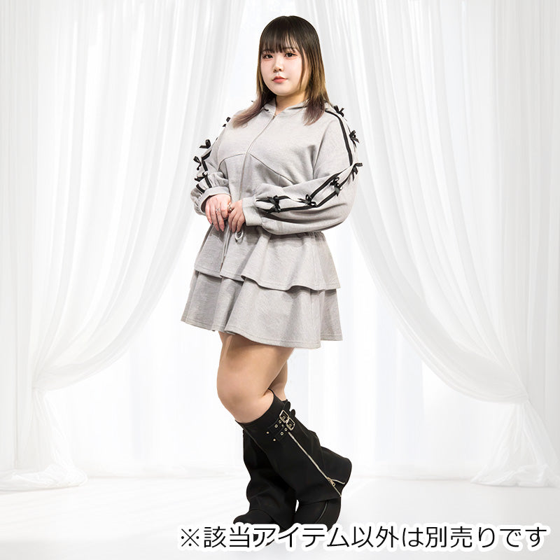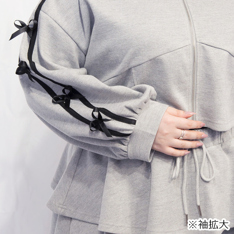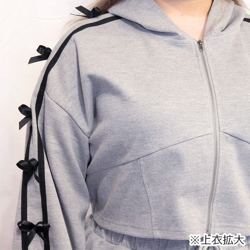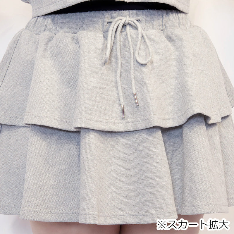 クロップド丈のパーカーと2段フリルのミニスカパンのセットアップです。