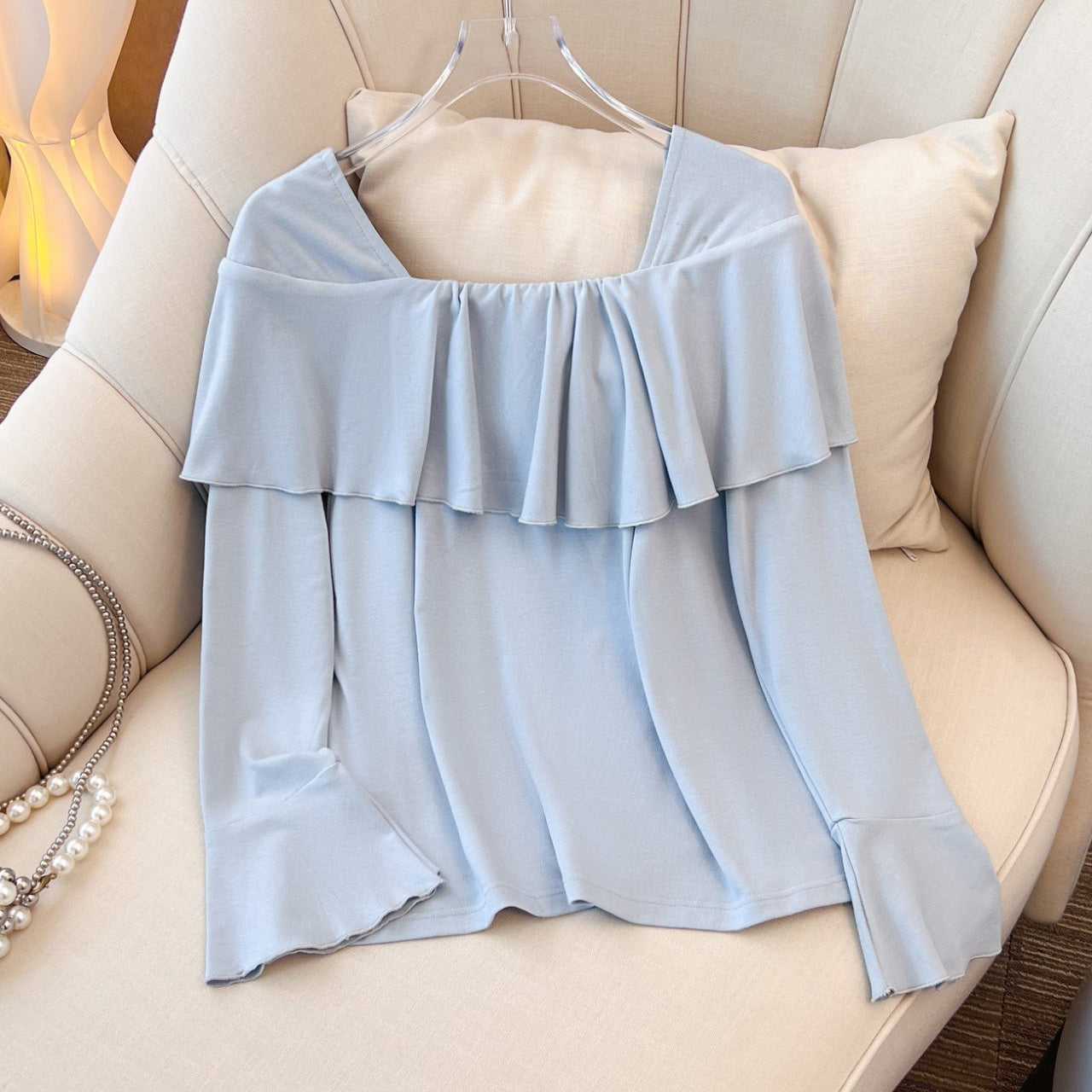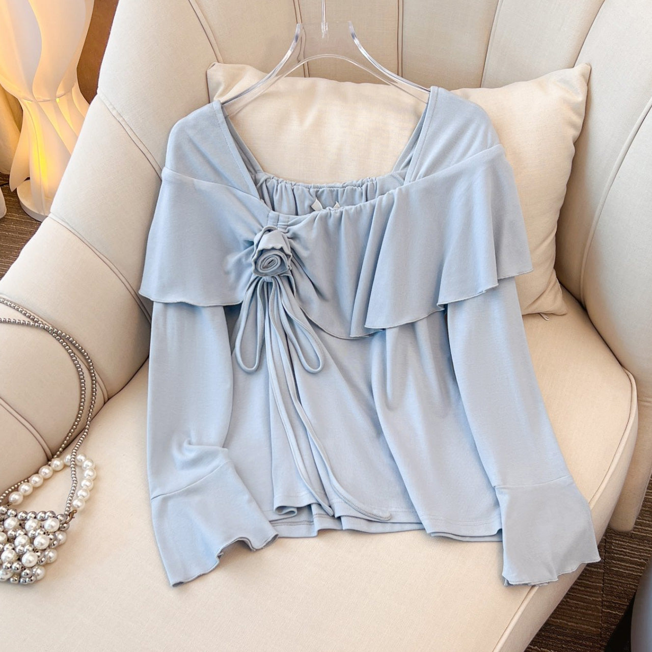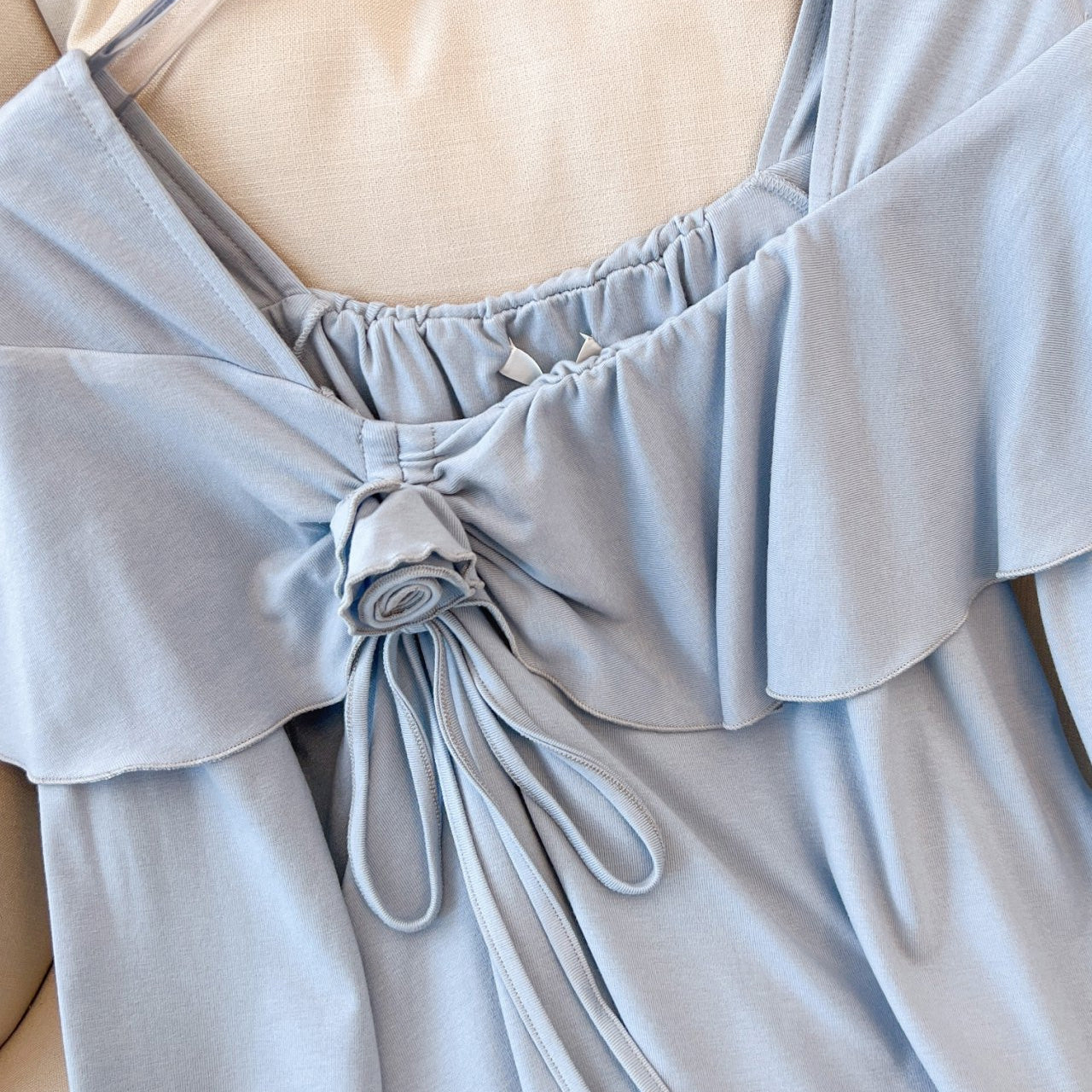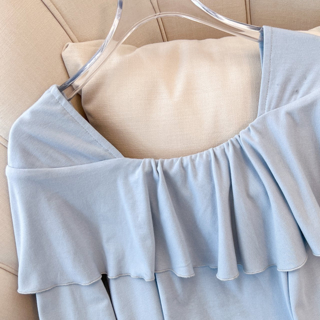 ふんわり優しいブルーのフリルデザイントップスと、動くたび揺れるホワイトのティアードスカートの組み合わせは、華やかさと体型カバーを両立!