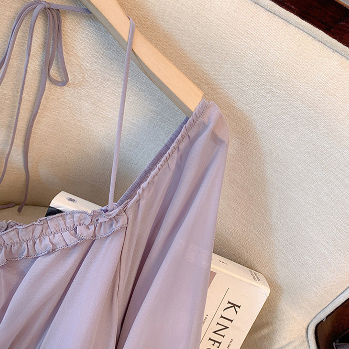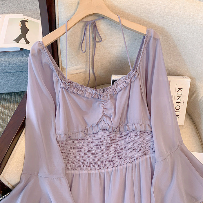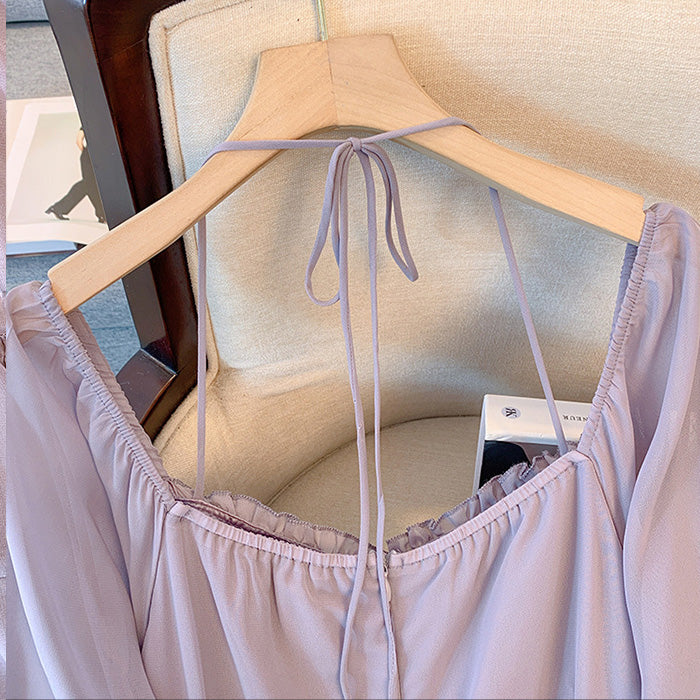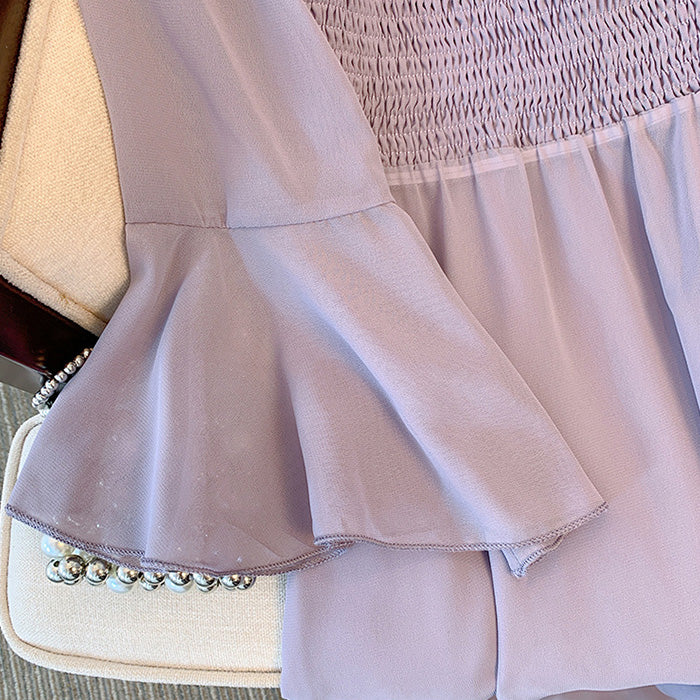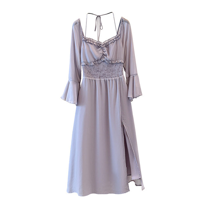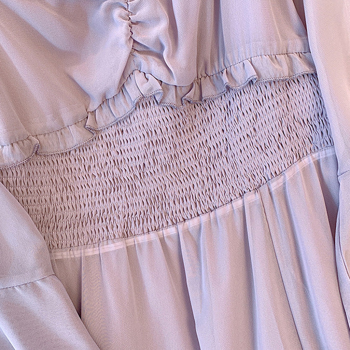 胸下切替でスタイルアップ効果も抜群。袖口には華やかなフレアを施し、手首をほっそり見せてくれる仕様。