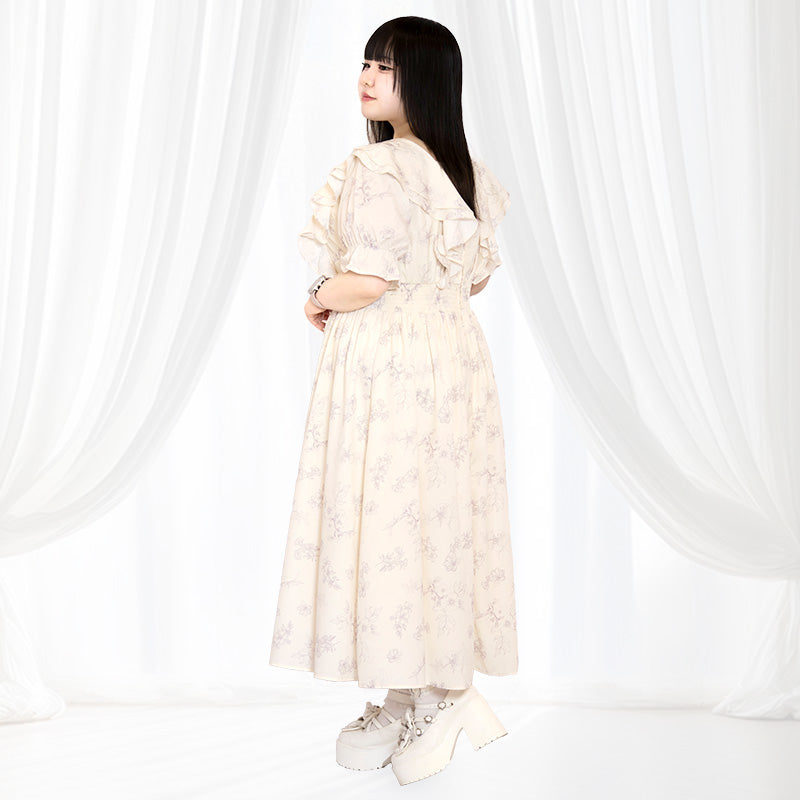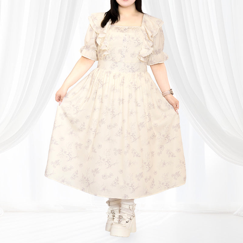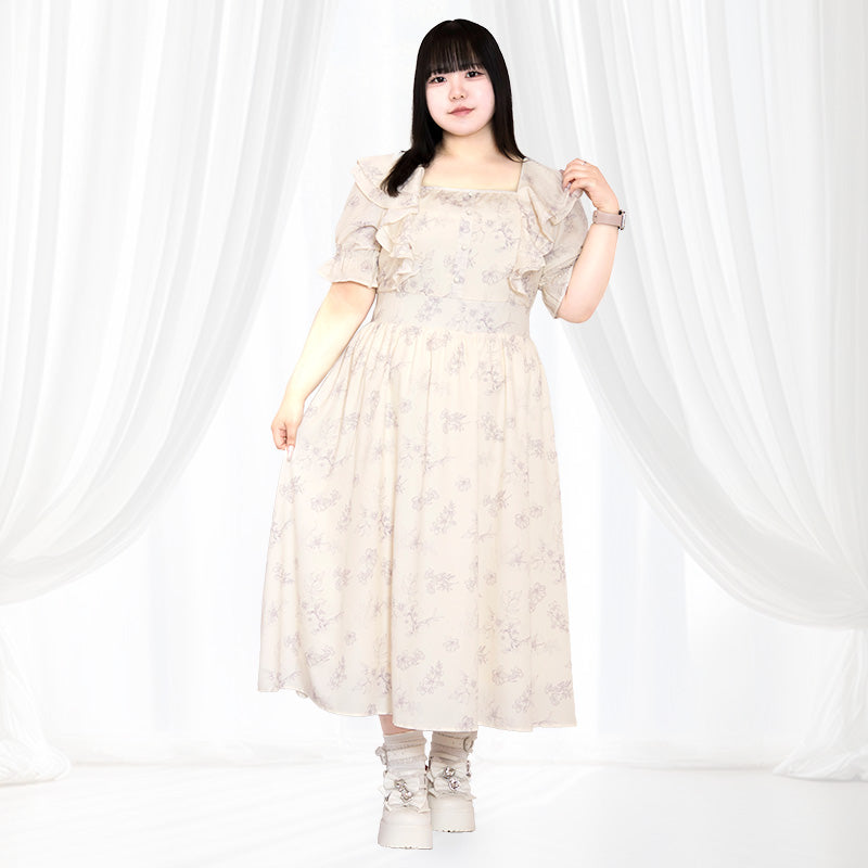 上品なフラワープリントとふんわり肩フリルが主役級の存在感を放つ、大きいサイズ専用ワンピース♡