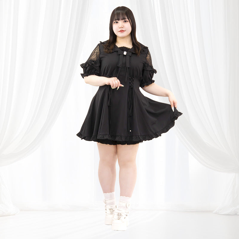 高めウエスト切替&編み上げデザインでウエスト細見え、スカートはふわっと広がって脚長効果も◎
