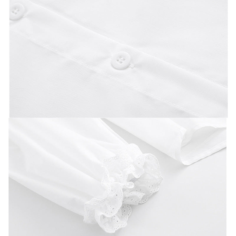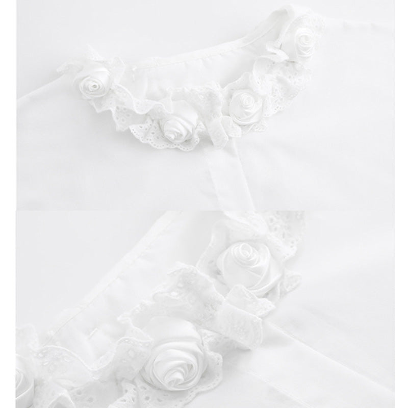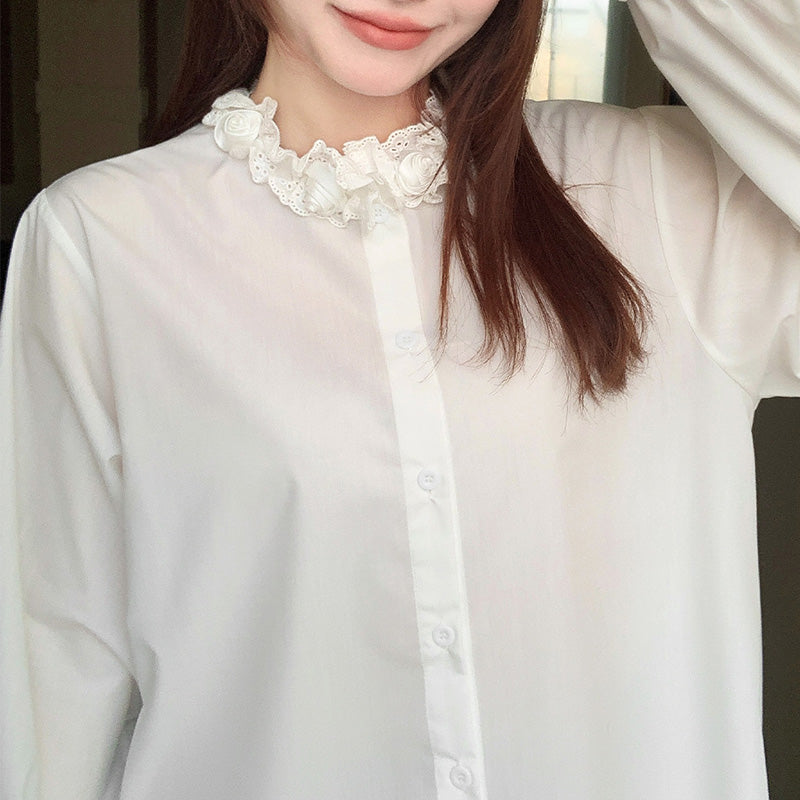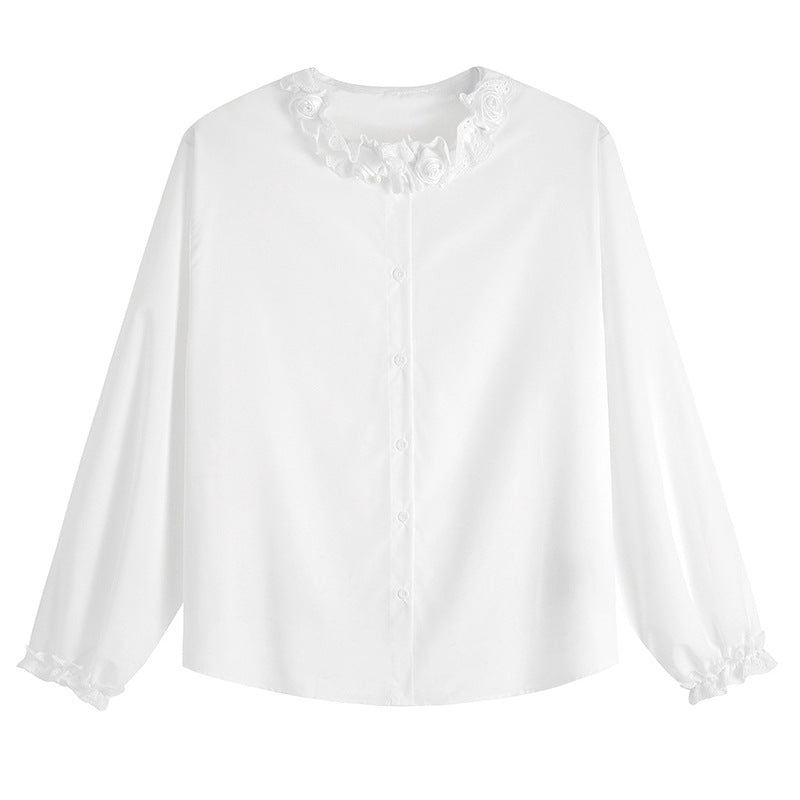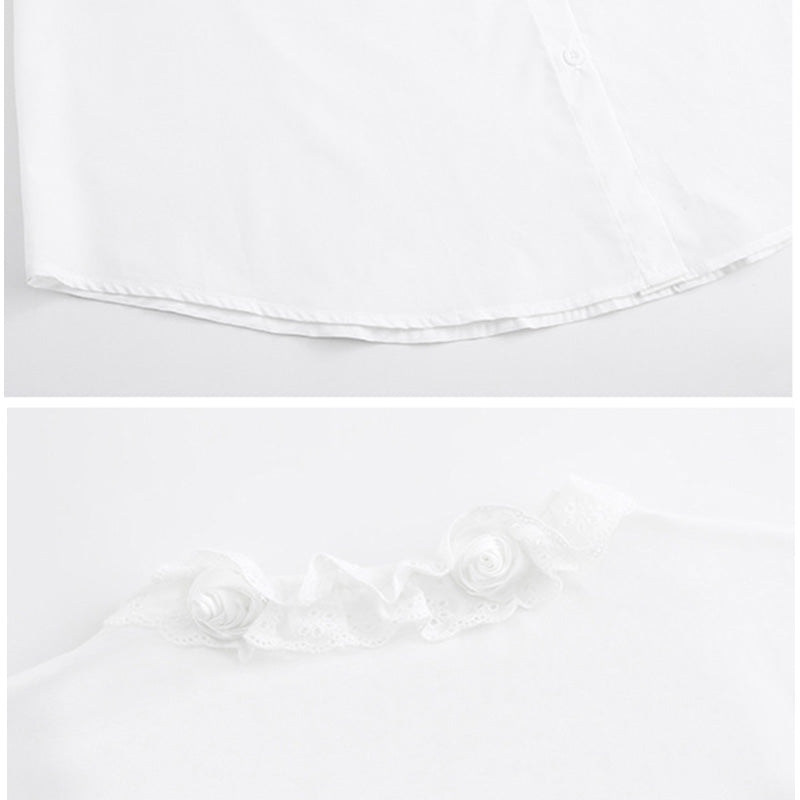 襟元には立体感のあるフラワーレースをあしらい、 顔まわりを華やかに見せてくれるデザイン。 シンプルなホワイトブラウスながらも、 フェミニンなディテールが上品さを引き立てます。
