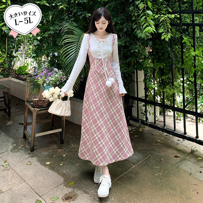 大きいサイズレディースチェックガーリー・ポンポンリボンワンピース(L/2L/3L/4L/5L)