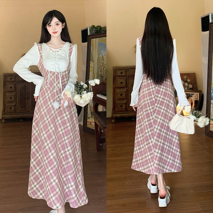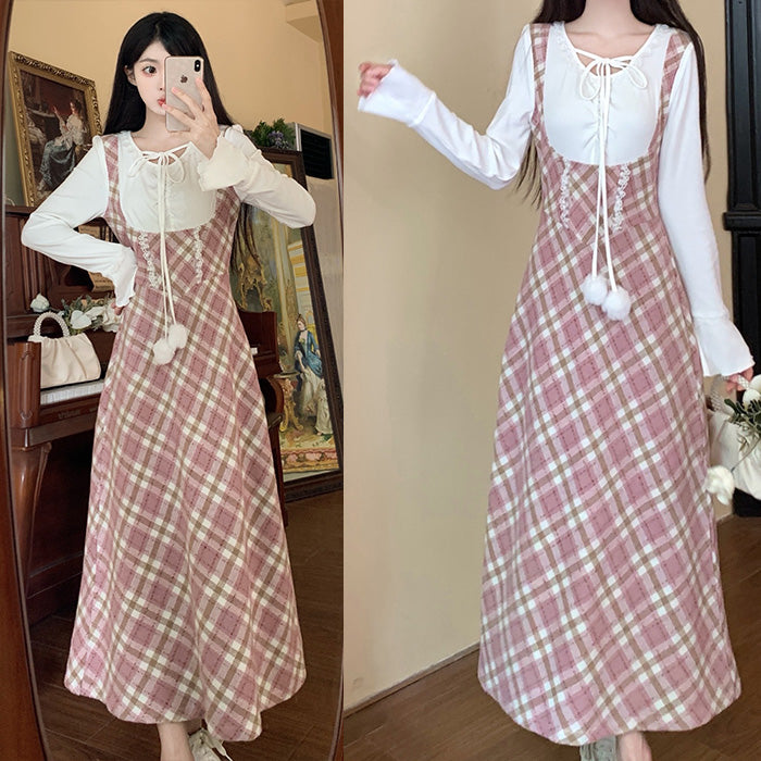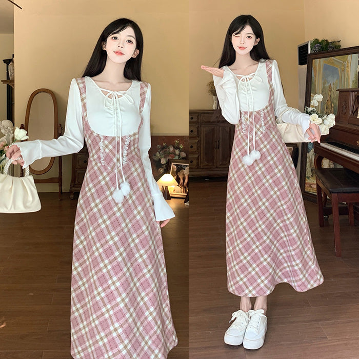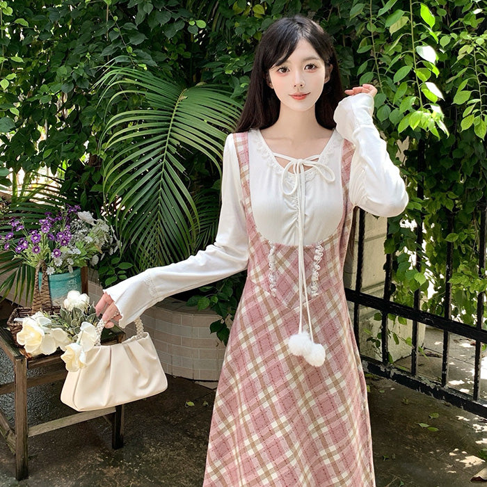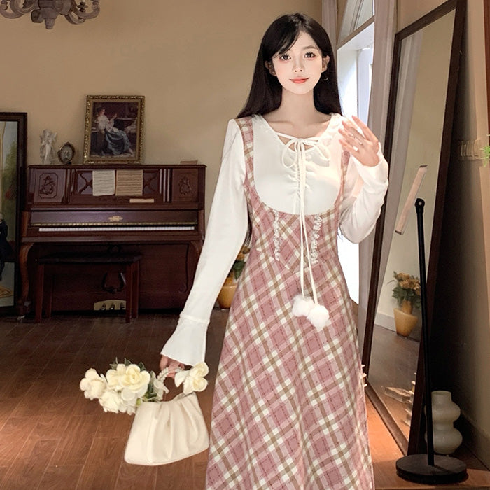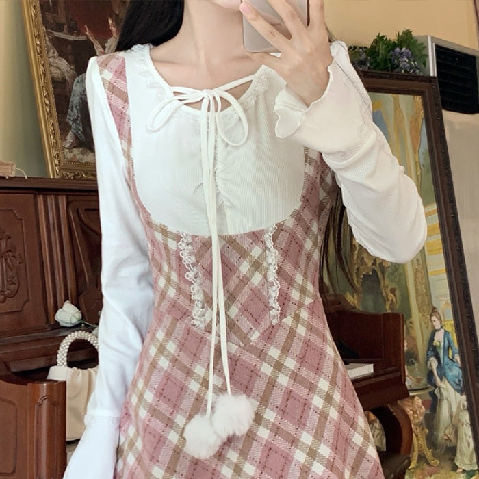 ふんわり可愛いチェック柄に、胸元のリボンとふわふわポンポンがアクセントになった