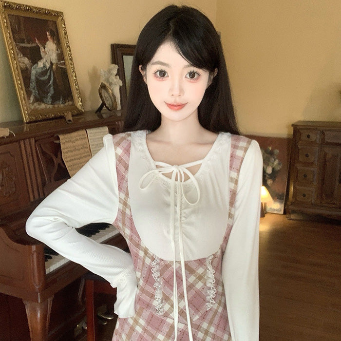 胸元のレースとリボンで縦のラインを強調し、スタイルアップ効果も抜群です。