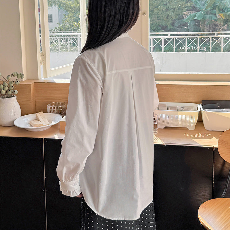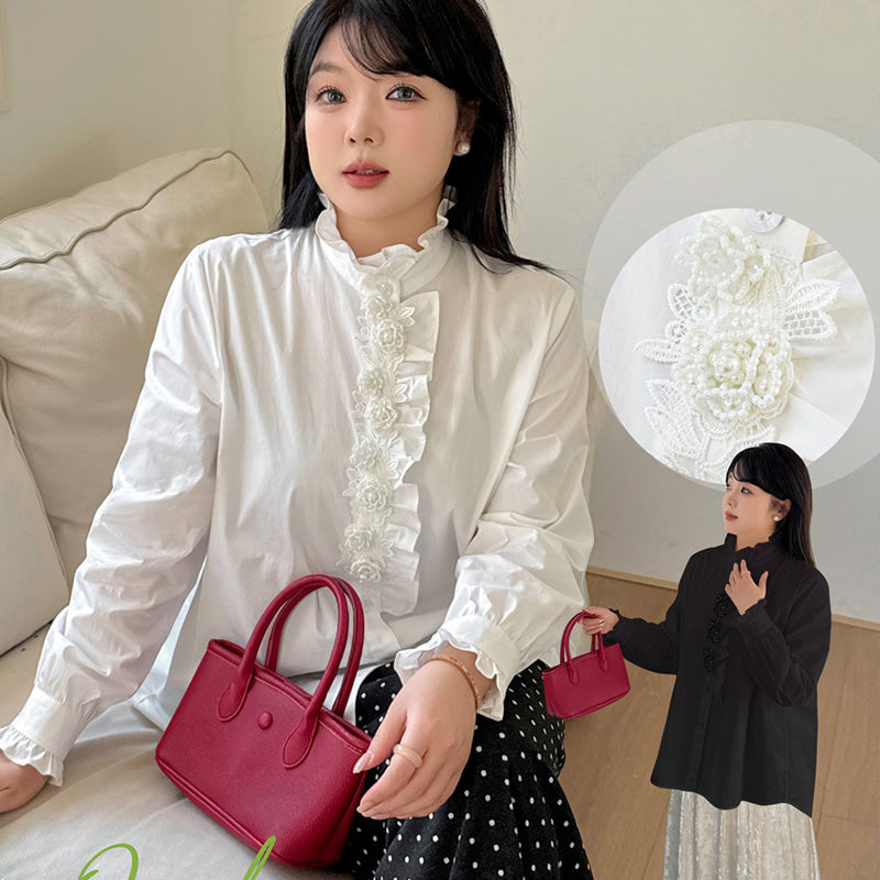 秋冬のおしゃれにぴったりな大きいサイズのブラウスが登場しました。 フロントにあしらわれた立体的なフラワーレースとパール調ビーズが、シンプルなシルエットに上品な華やかさをプラス。 首元のフリルと袖口のシャーリングがクラシカルな印象を演出し、ぽっちゃり女子さんも自然に体型カバーできるデザインです。