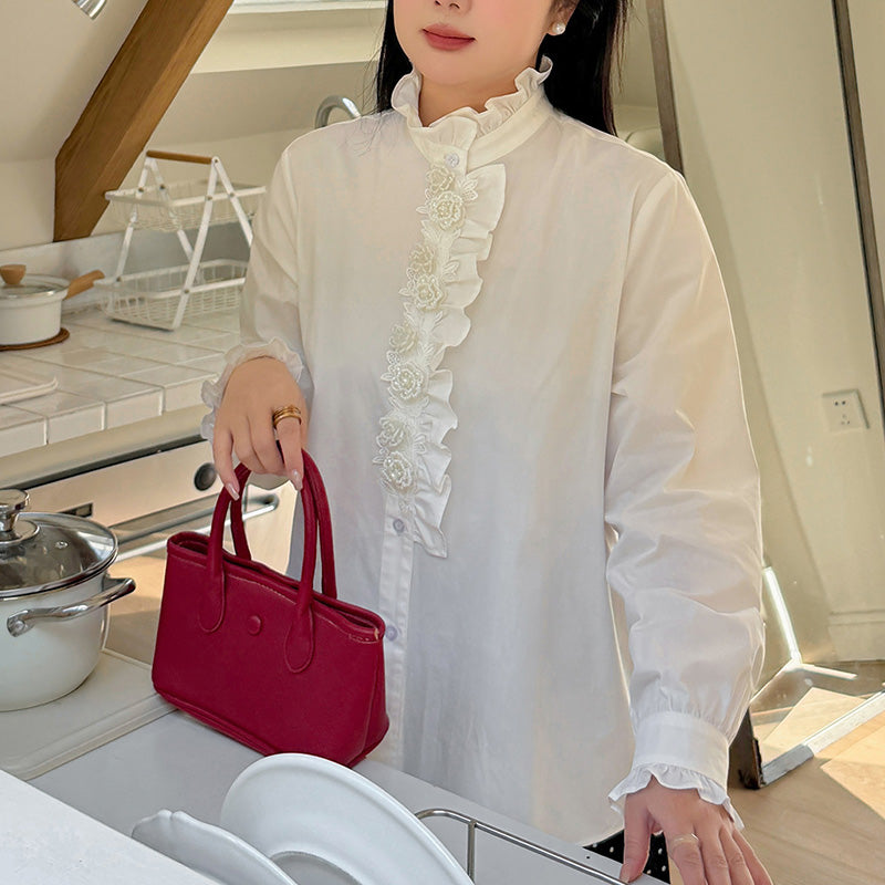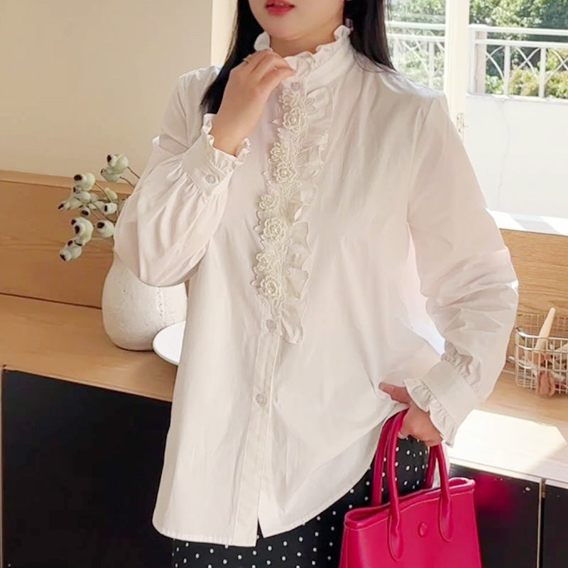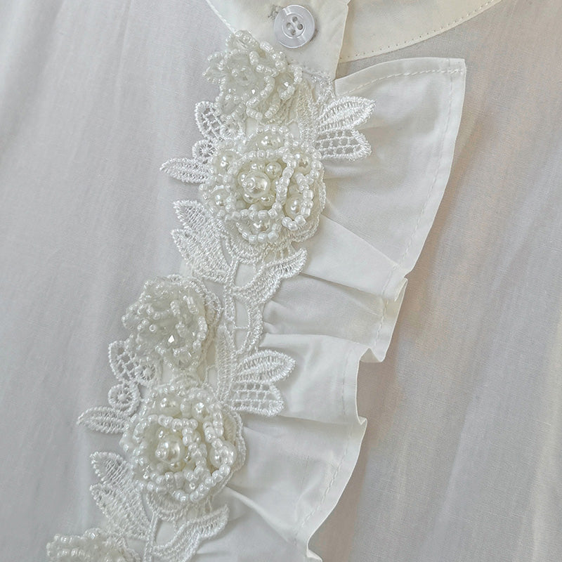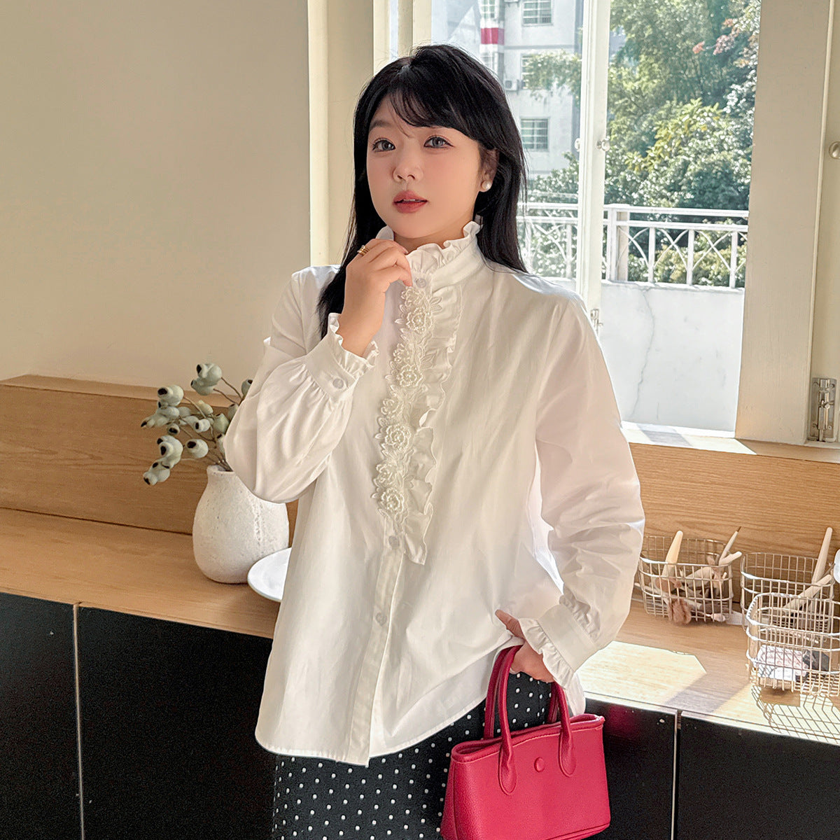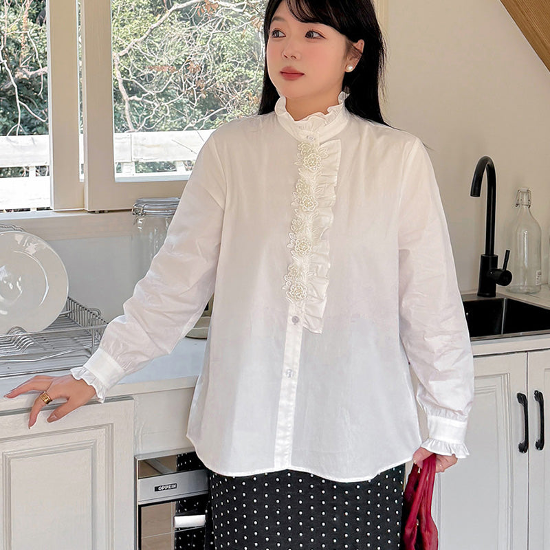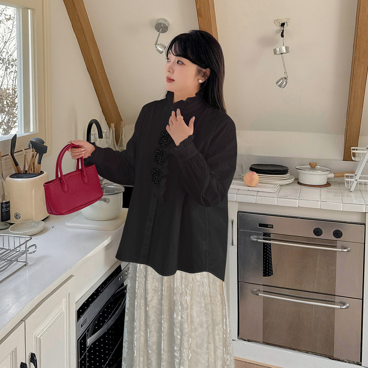 大きいサイズレディースローズビーズデザインのスタンドカラーレースフレンチシャツ (LL/3L/4L/5L)