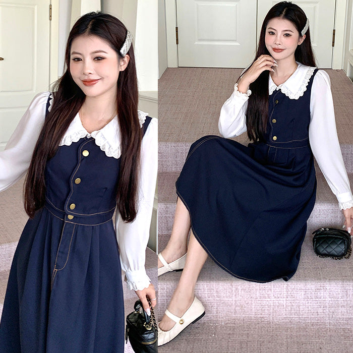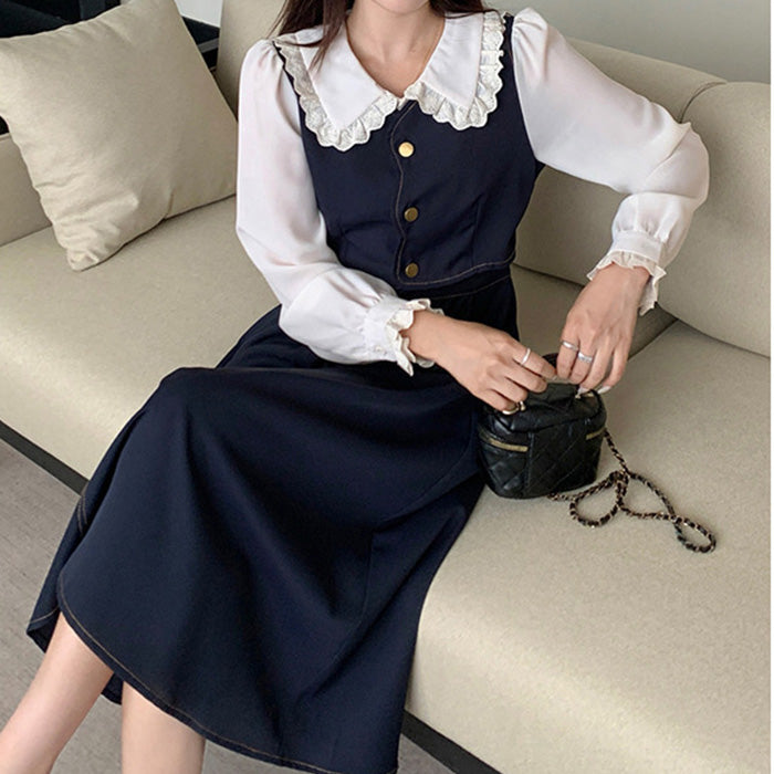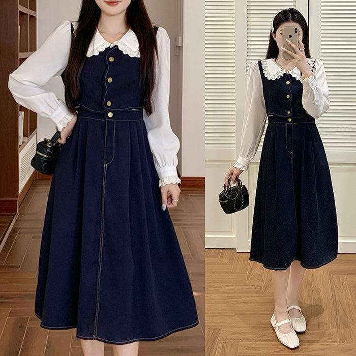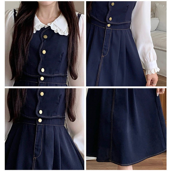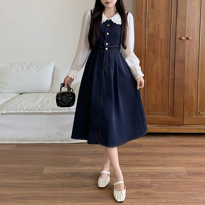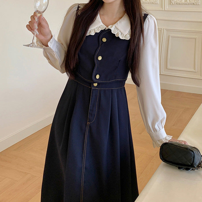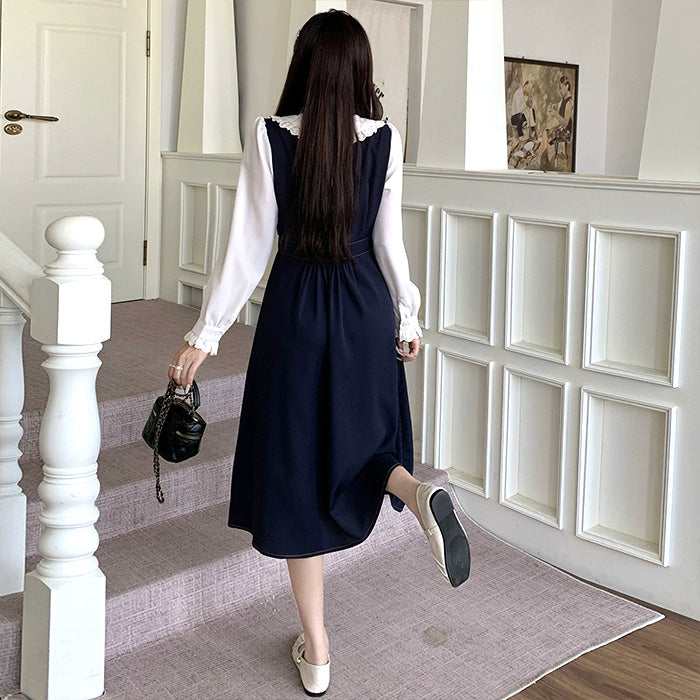柔らかなシフォン風の白ブラウスと、ネイビーのジャンパースカートがドッキングされたようなデザインで、1枚でコーデが完成。クラシカルなレース襟とゴールドボタンがアクセントになり、上品で可憐な雰囲気を演出します。ウエスト位置が高めに設定されているため、自然にスタイルアップして見えるのも嬉しいポイントです。