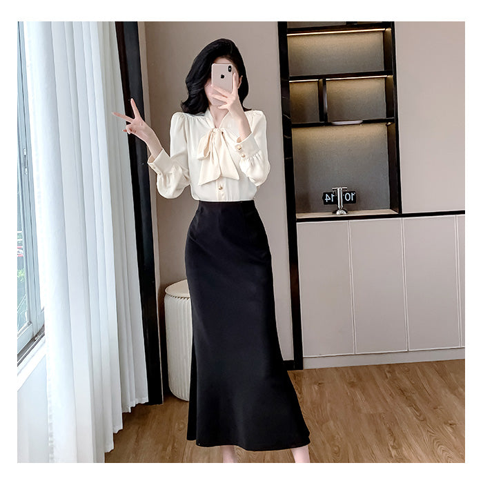 上品なアイボリーnにボトムはブラックの組み合わせは、通勤やお出かけ、特別な日のコーデにも◎。