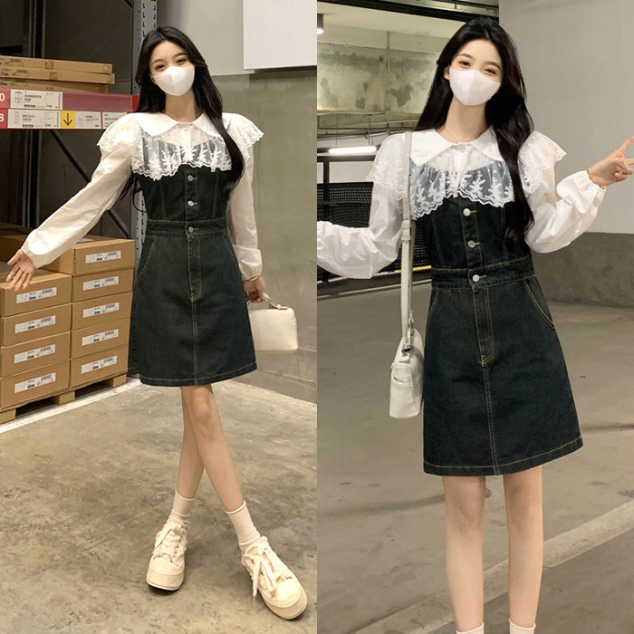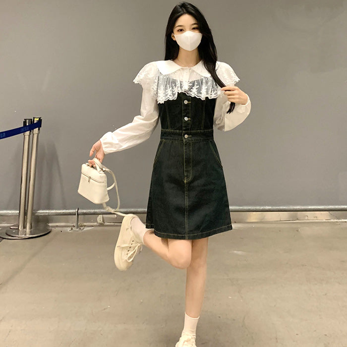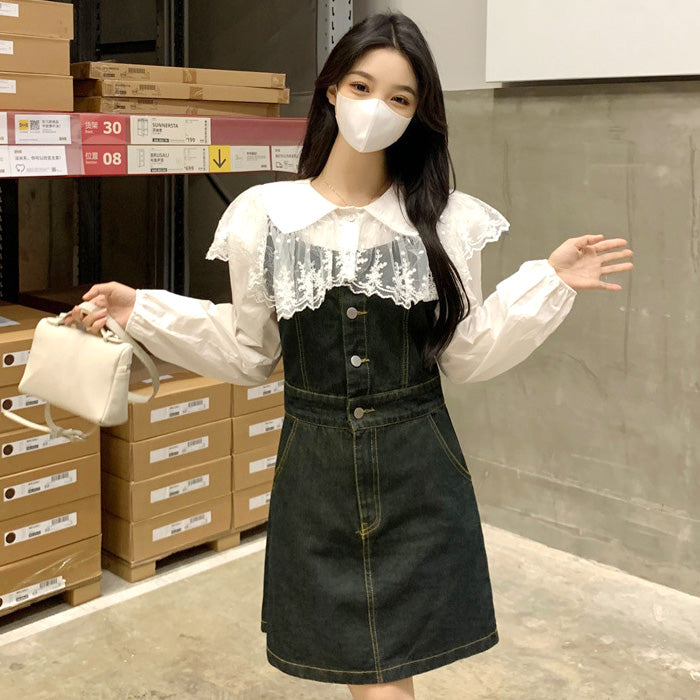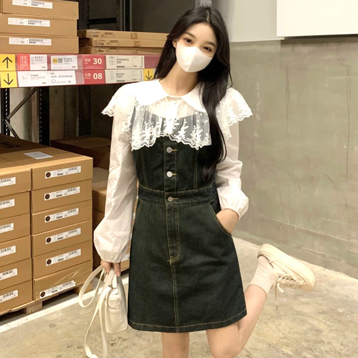 大きいサイズレディースレトロガーリー・デニムジャンスカワンピ&ブラウスの2点セット(L/LL/3L/4L/5L)
