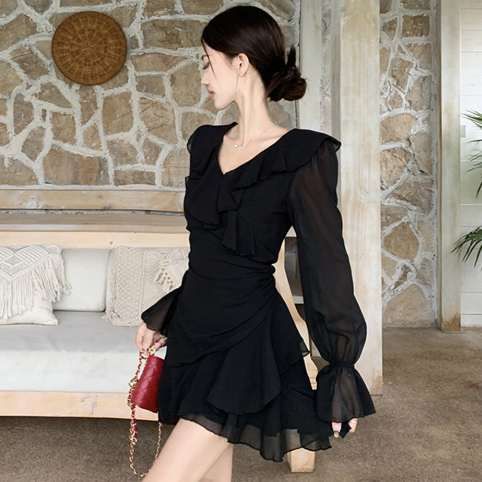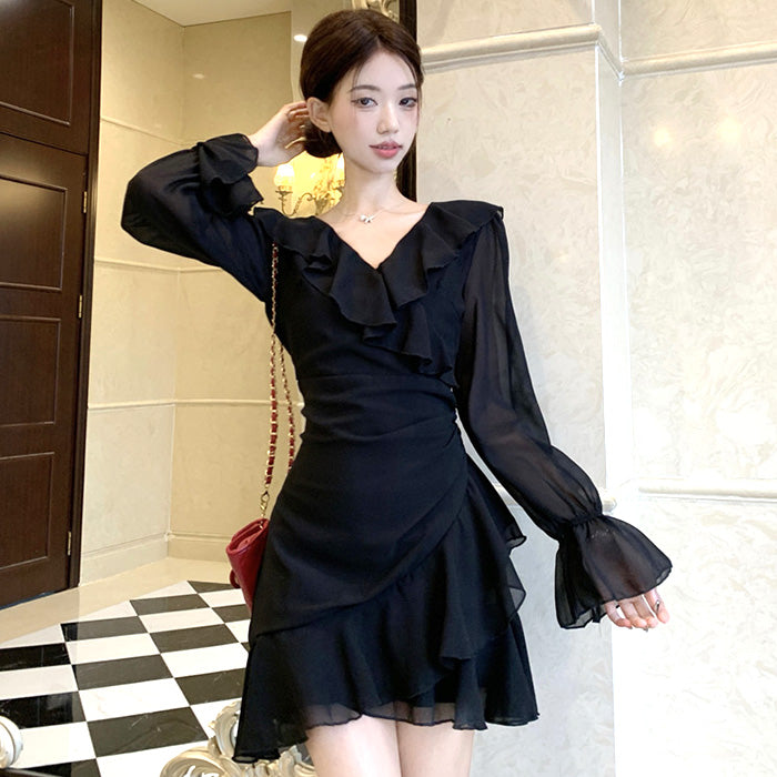 ふわっと広がる軽やかなシフォン素材と、上品なブラックカラーが印象的な秋冬ワンピースです。