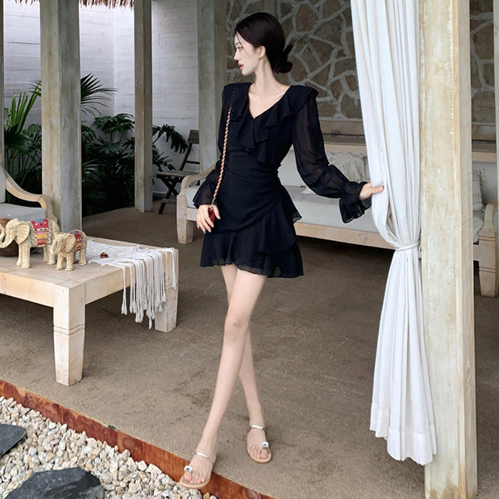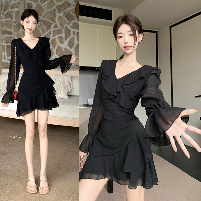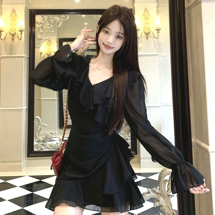 ふわっと広がる軽やかなシフォン素材と、上品なブラックカラーが印象的な秋冬ワンピースです。