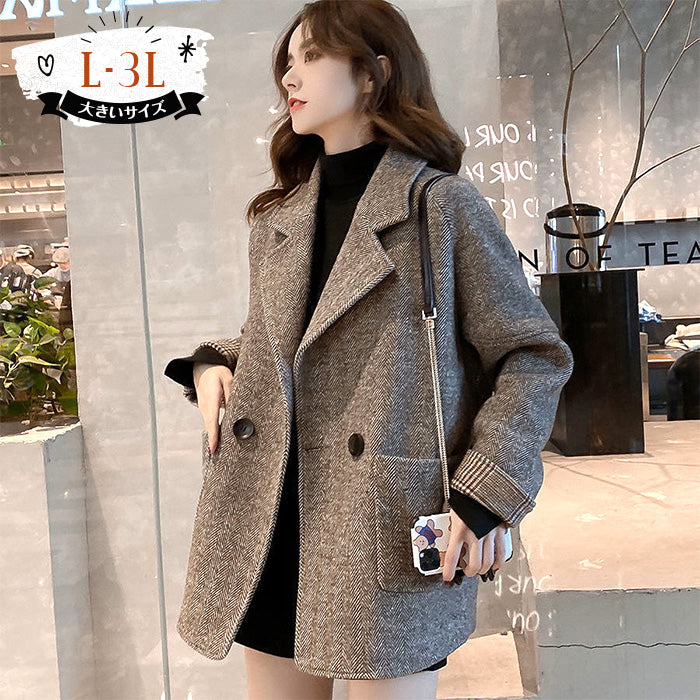 秋冬に欠かせない大人の定番アウターとしておすすめしたい、大きいサイズのヘリンボーン柄コートです。