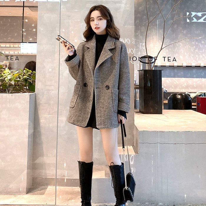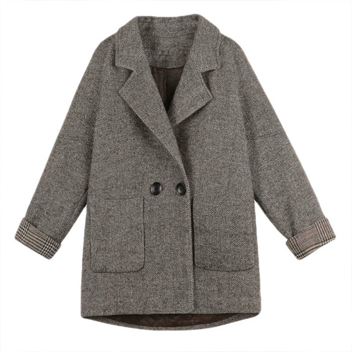 大きめの襟とダブルボタンデザインが、シンプルながらも洗練された印象をプラス。