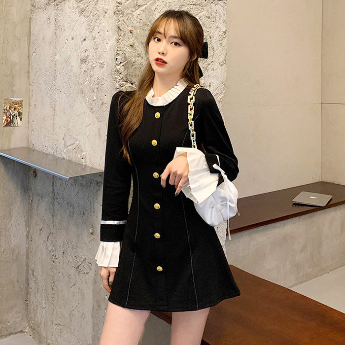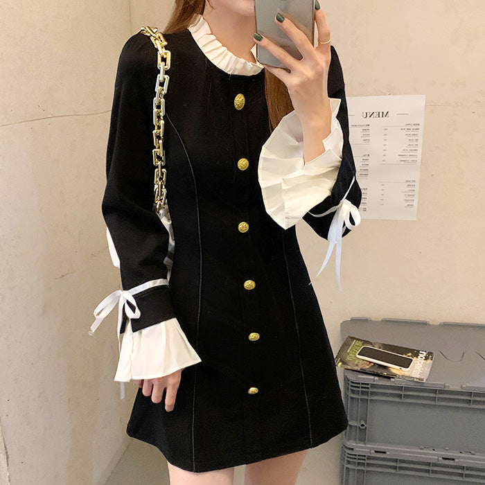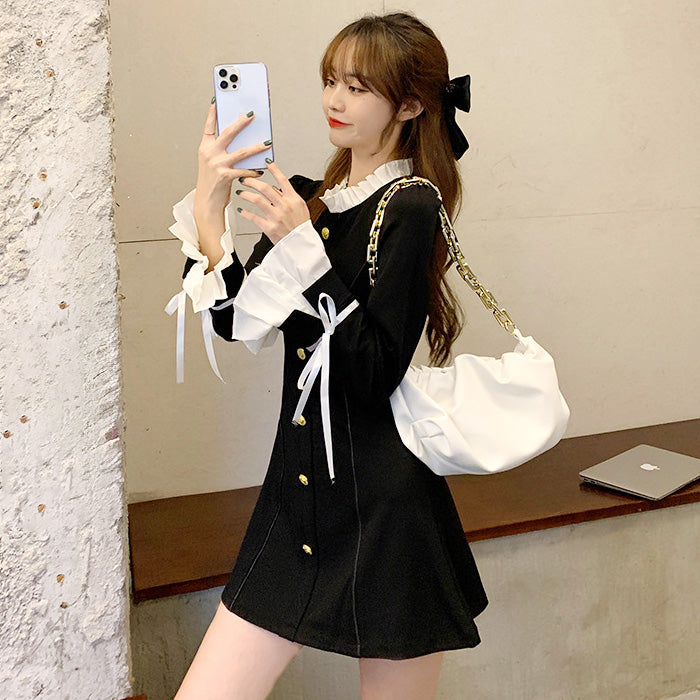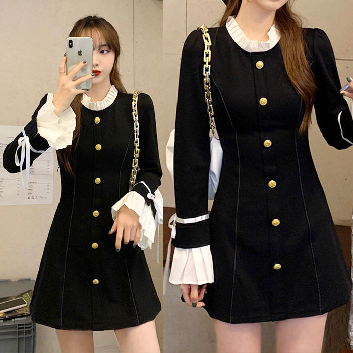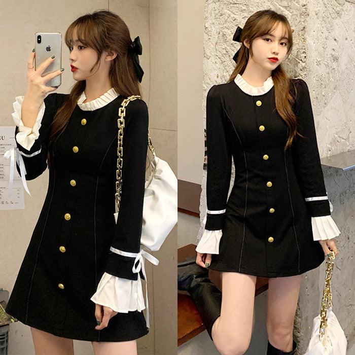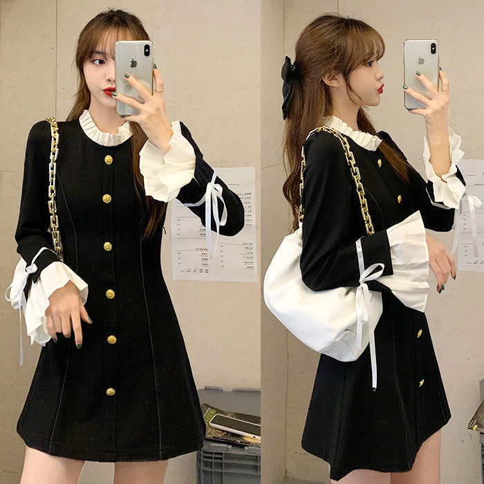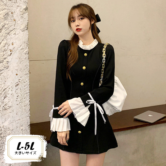 モノトーン配色がクラシカルな印象を与えつつ、袖口のリボンとフリルが女性らしさをプラス。