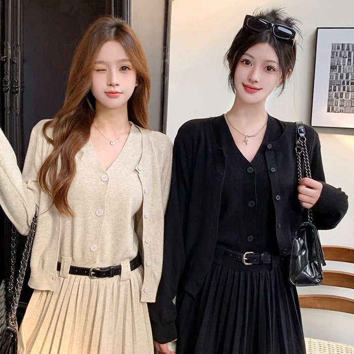 トップスはVネックデザインで顔まわりをすっきり見せつつ、羽織りやすいカーディガン付き。