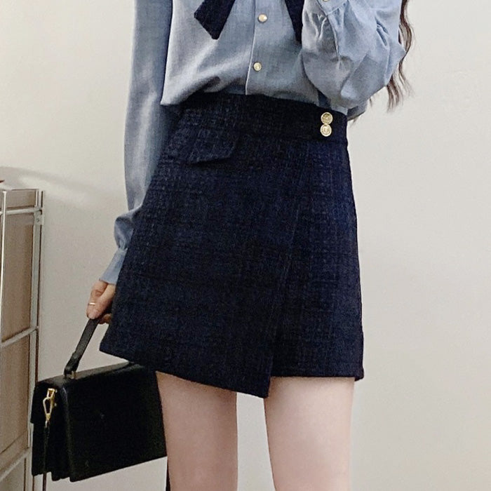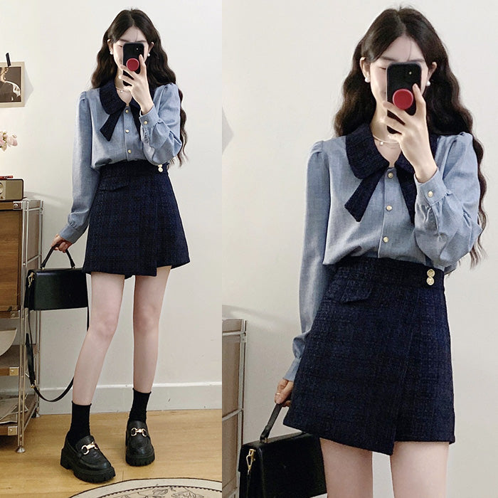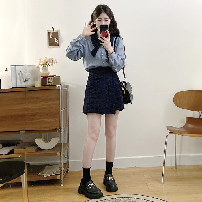 クラシカルなツイード素材のスカートと、襟元のリボンが可愛いブラウスの組み合わせで、大人ガーリーなコーデが1セットで完成します。