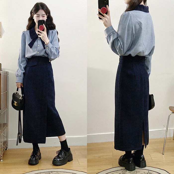 クラシカルなツイード素材のスカートと、襟元のリボンが可愛いブラウスの組み合わせで、大人ガーリーなコーデが1セットで完成します。