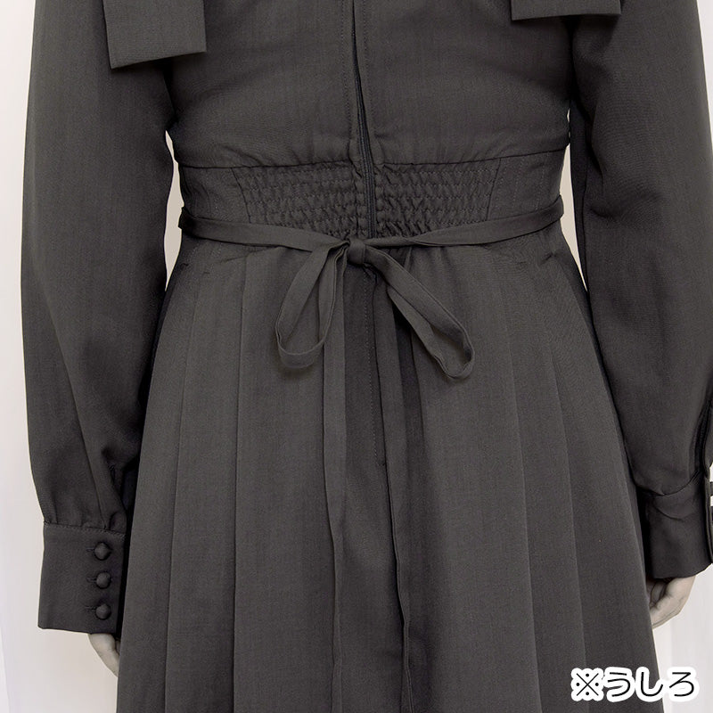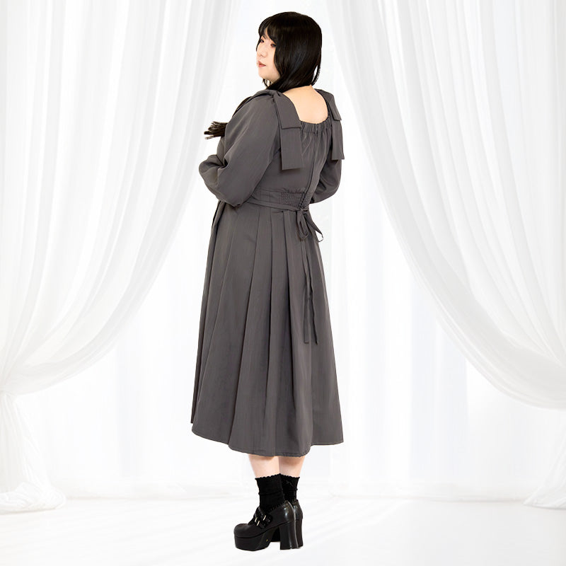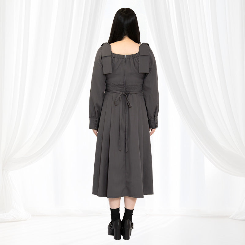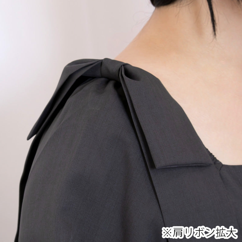 肩の大きめリボンが印象的で、後ろ姿まで愛らしい。スクエアネックの首元はデコルテをきれいに見せ、顔まわりを明るく演出します。