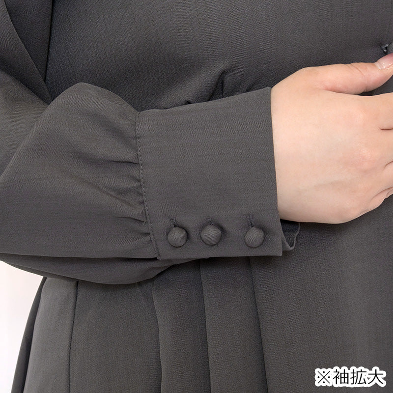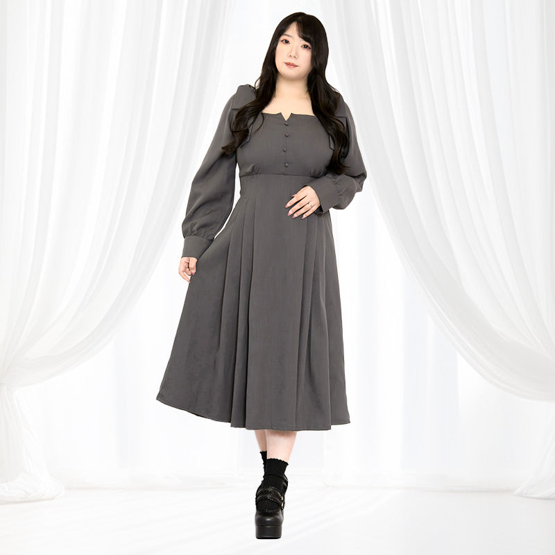 プラスサイズの女性が自信をもって輝ける一着。落ち着いたチャコールグレーで、甘すぎず大人っぽい印象に。