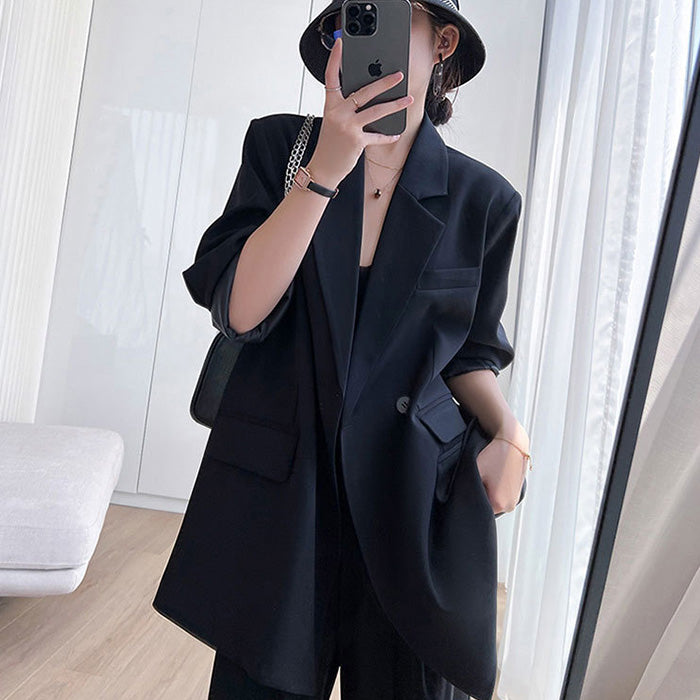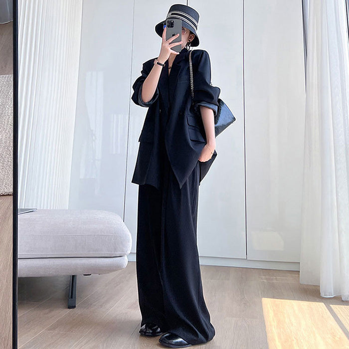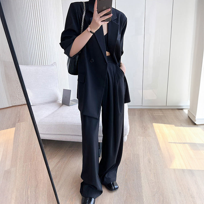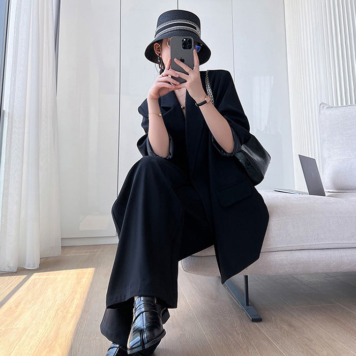 さらっと羽織れるジャケットと、落ち感のあるワイドパンツがセットになったプラスサイズ仕様。